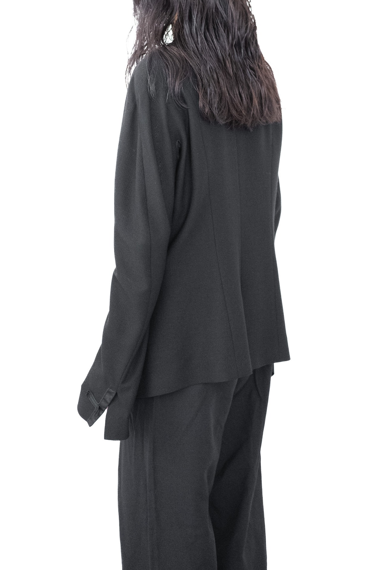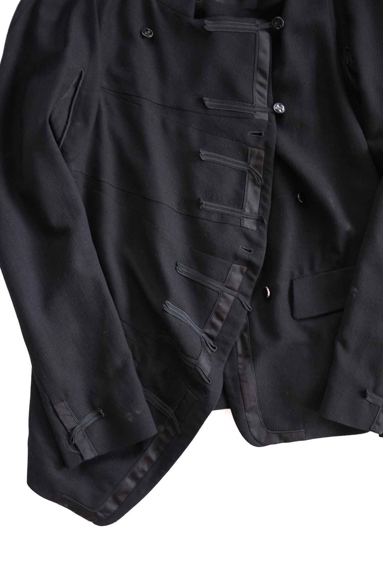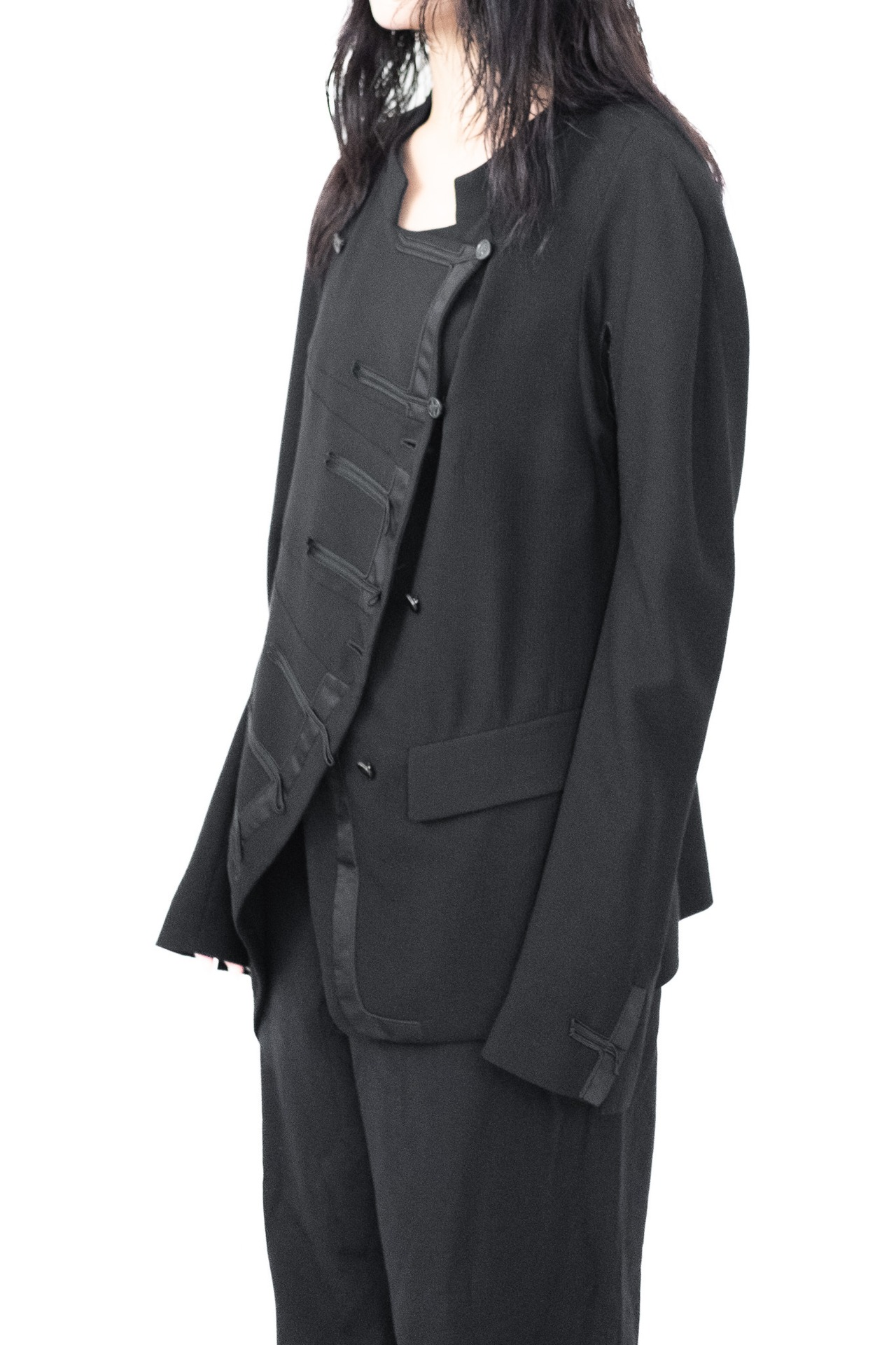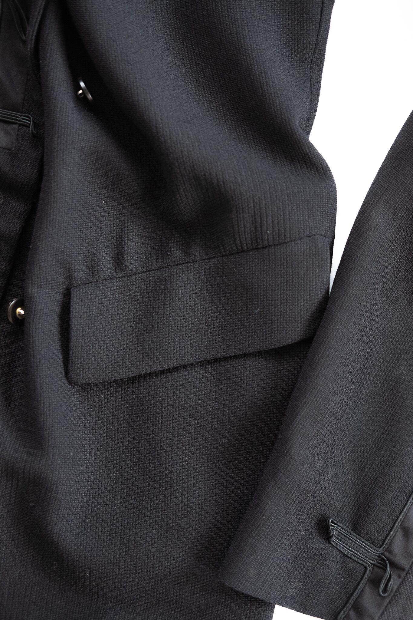 一見するとクラシカルなナポレオンジャケットを思わせる装飾性を持ちながら、そこに収まらない強い現代性を備えています。