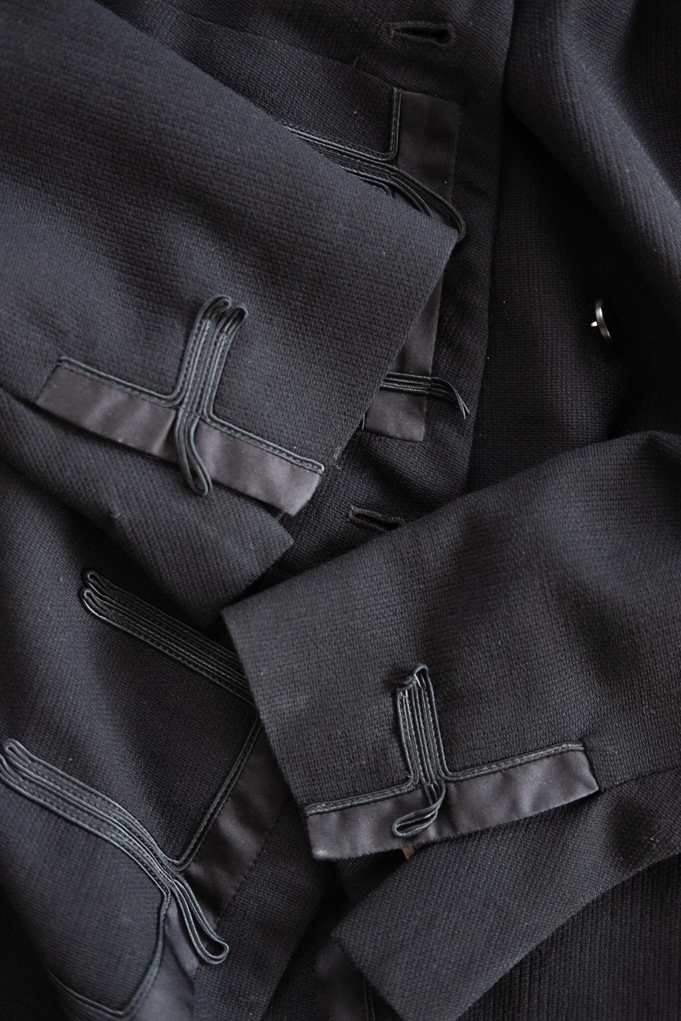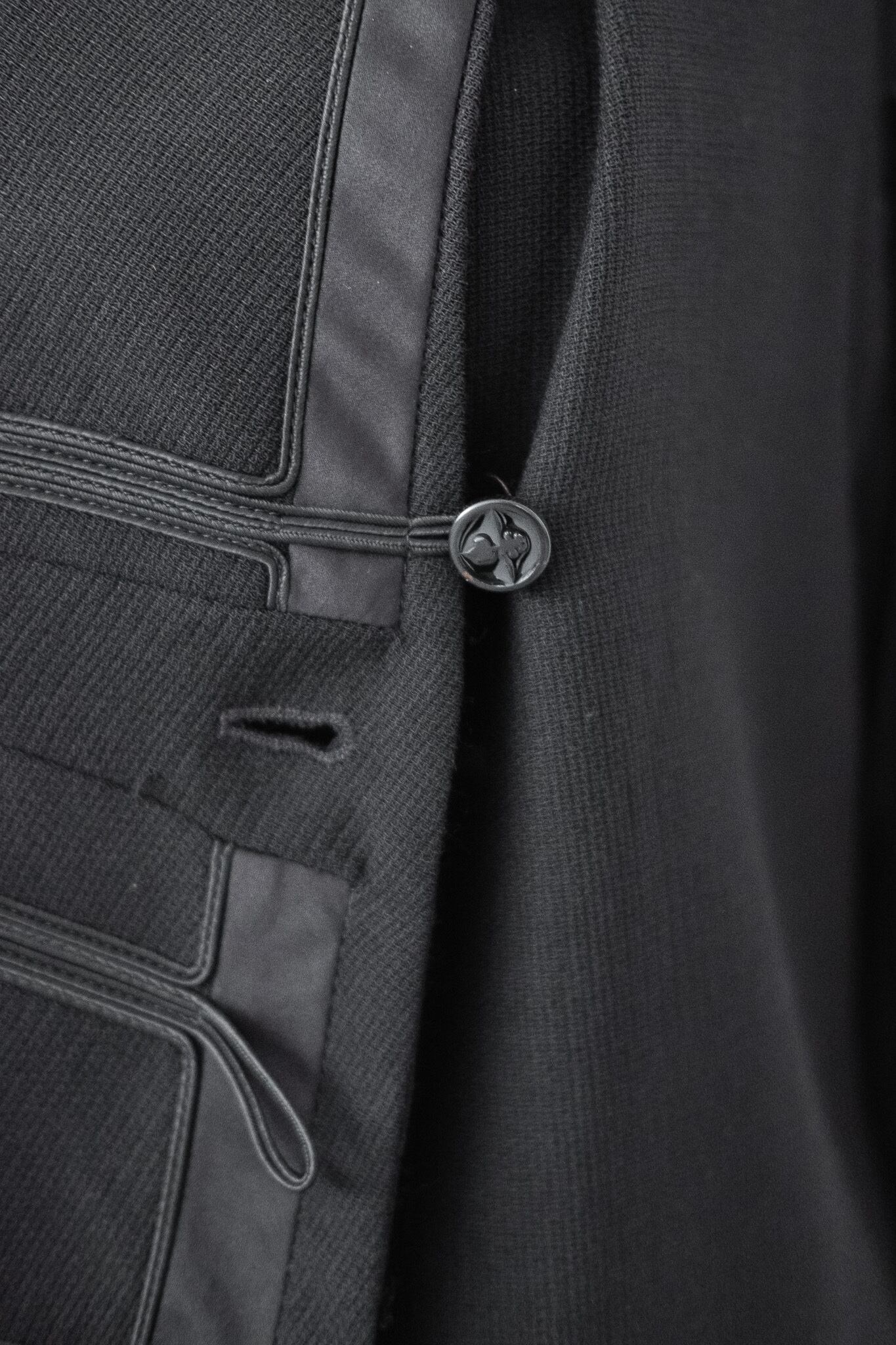 フロントには斜めに走るアシンメトリーの前合わせを採用し、複数のループとボタンで留める独自のクロージャーを配置。左右の均整をあえて崩すことで、視覚的なインパクトと動きのあるシルエットを両立させています。軍服由来の装飾的要素を取り入れながらも、それをそのまま踏襲するのではなく、モードとして再解釈する姿勢こそジルボーらしさの真骨頂といえるでしょう。