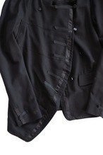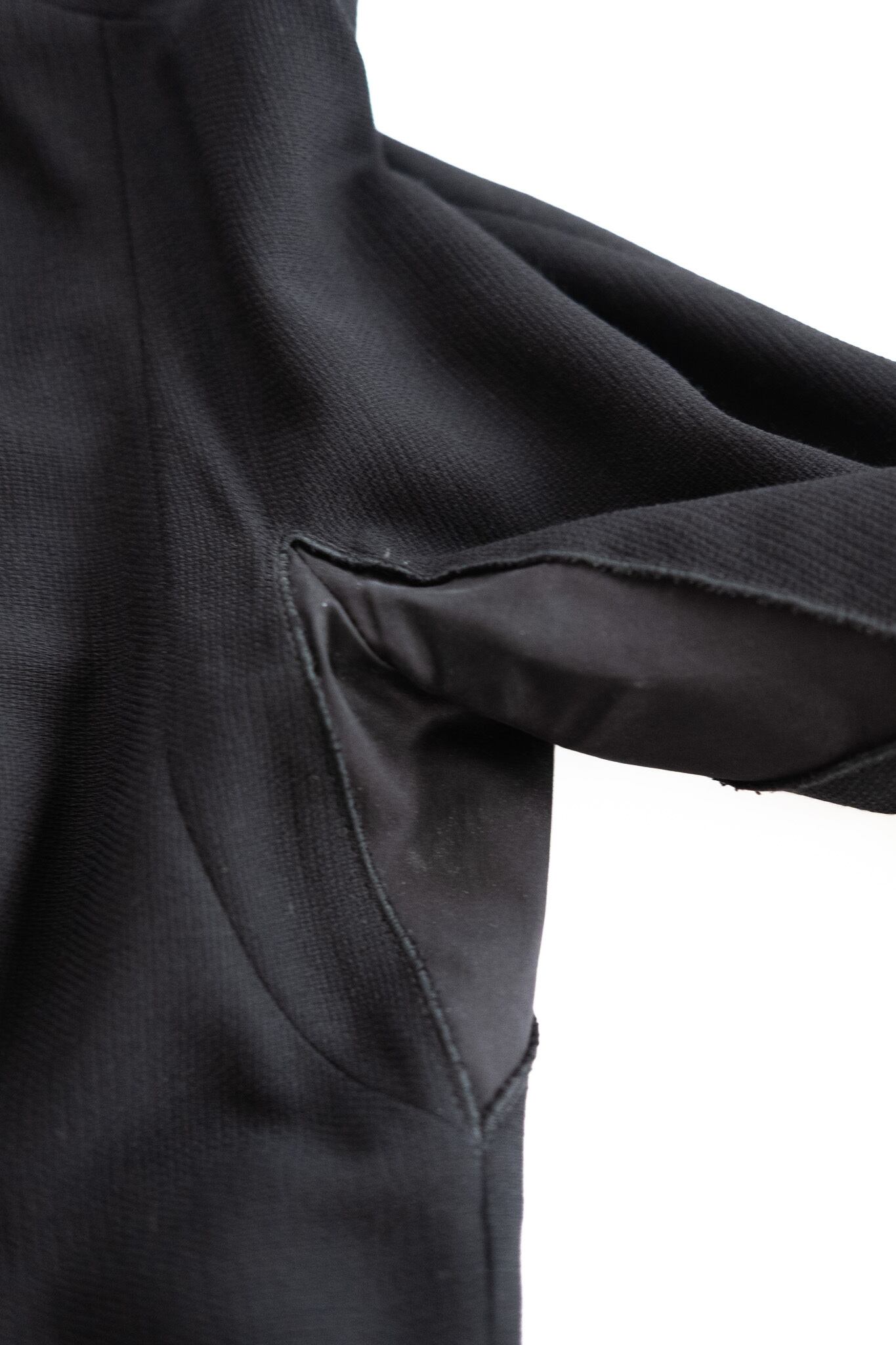 また、随所に機能性を感じさせるディテールが仕込まれています。腋下部分には別布で切り替えたガゼットを配置し、腕の可動域を広げる設計に。これはスポーツウェアやワークウェアの構造を思わせるもので、実際の着用時にストレスを軽減し、身体の動きに自然に馴染みます。つまりこのジャケットは、見た目の前衛性だけでなく、着用者の身体感覚に寄り添ったリアリティを備えているのです。