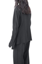 着用時には、前をすべて閉じれば直線的なモード感を、ボタンをいくつか外せばドレープの動きを強調した立体的なシルエットを楽しめます。ノーカラーの首元はインナーを選ばず、シャツやカットソーを差し込むだけで現代的なバランスを生み出すことができます。テーラードの要素とミリタリーの意匠が交錯することで、フォーマルにもカジュアルにも振れる懐の深さを持った一着です。