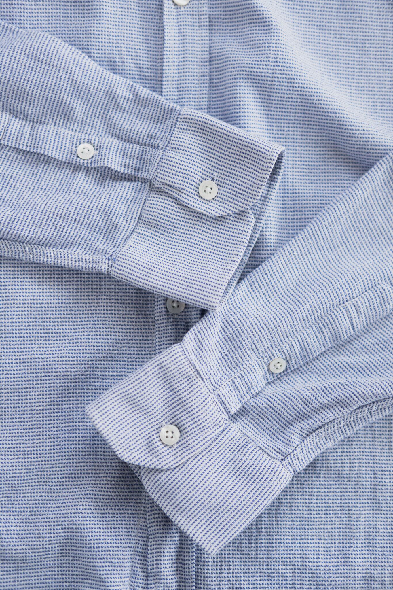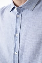 一見するとシンプルなライトブルーのシャツですが、近づいてみると表情は一変します。生地には極小のドビー織りによるマイクロテクスチャーが施されており、遠目にはプレーンに見えながらも、光の加減や角度によって細やかな陰影が浮かび上がります。まるで無地と柄のあいだを往復するようなニュアンスがあり、日常使いのシャツに奥行きを与えているのが特徴です。この「遠目では無地、近くで見ると情報量のある織り」というアプローチは、エンポリオ・アルマーニが2000年代後半から積極的に取り入れていた表現のひとつです。