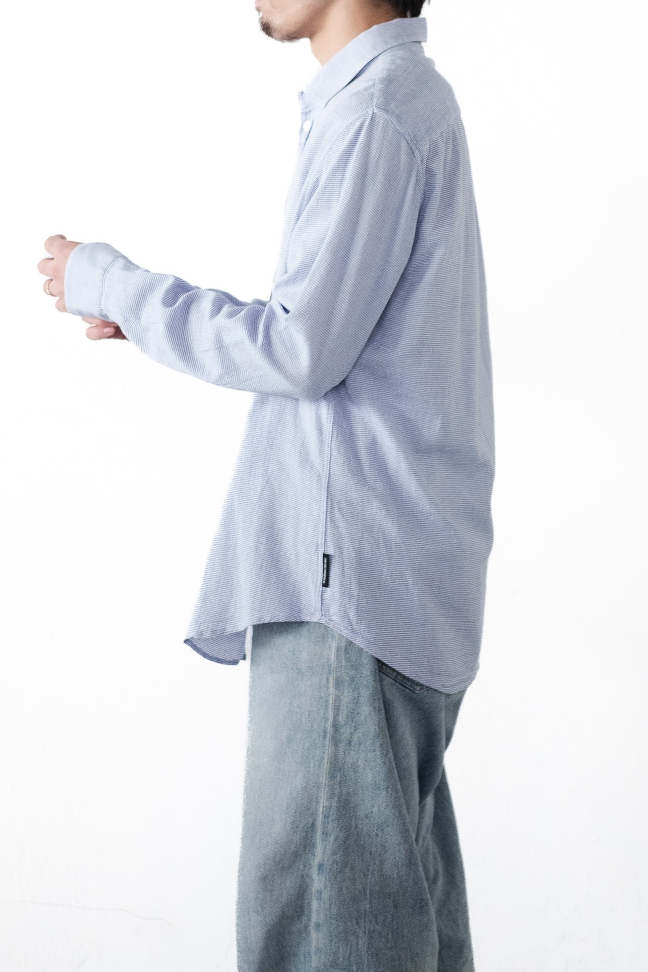 ディテールを見ても、時代性がよく表れています。小ぶりなレギュラーカラーは、ノンフューズに近い柔らかさを持ち、第一ボタンを外した際に自然なロールを描きます。ドレスシャツの硬さを削ぎ落とし、リラックスしたムードを漂わせながらも、だらしなくは見えない絶妙な設計。カフスはラウンド型でシンプルに、袖の脇にはブランドのフラッグタグが控えめに縫い付けられ、都会的なアイデンティティを主張しています。