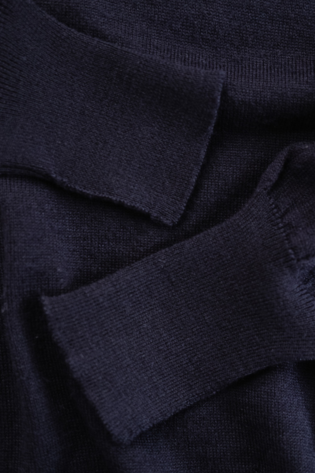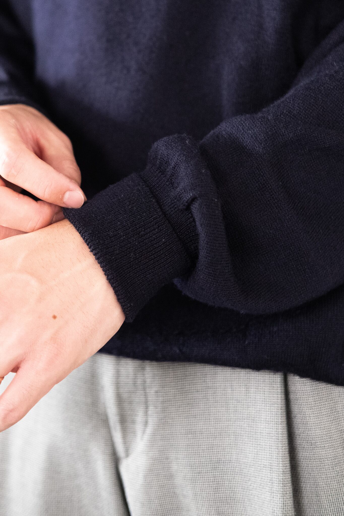 シルエットもただのベーシックでは終わりません。肩から袖にかけて落ちるラインが自然で、着たときの落ち感に上品さが宿る。ネイビーというカラーリングもまた秀逸で、光の具合によって深い黒にも近づけば、青みが際立って軽やかにも映る。シンプルな一着なのに、表情の豊かさには驚かされます。