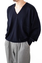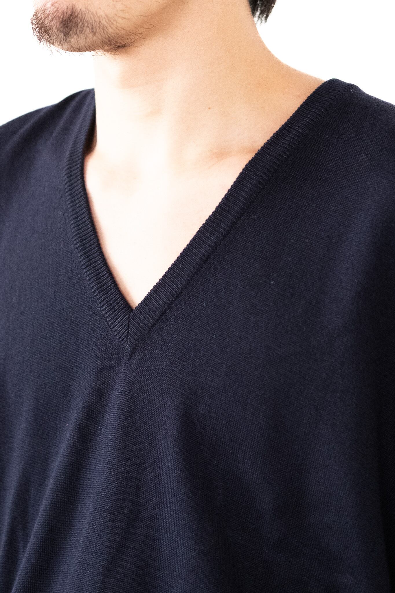 デザインはあくまでもミニマルで、流行に左右されないクラシックな形。程よい深さのVネックはシャツを覗かせても、素肌にそのまま纏っても美しく収まり、インナー使いでも単体でも成立する万能性を備えています。肩から身幅にかけてはゆとりを持たせ、裾と袖口はしっかりとしたリブで引き締めることで、90年代らしいゆったりとした空気感と品の良いシルエットを両立。フロント下部には同色糸で控えめに施された「V」ロゴ刺繍が置かれ、主張しすぎないブランドの存在感を漂わせています。