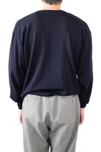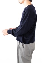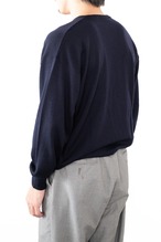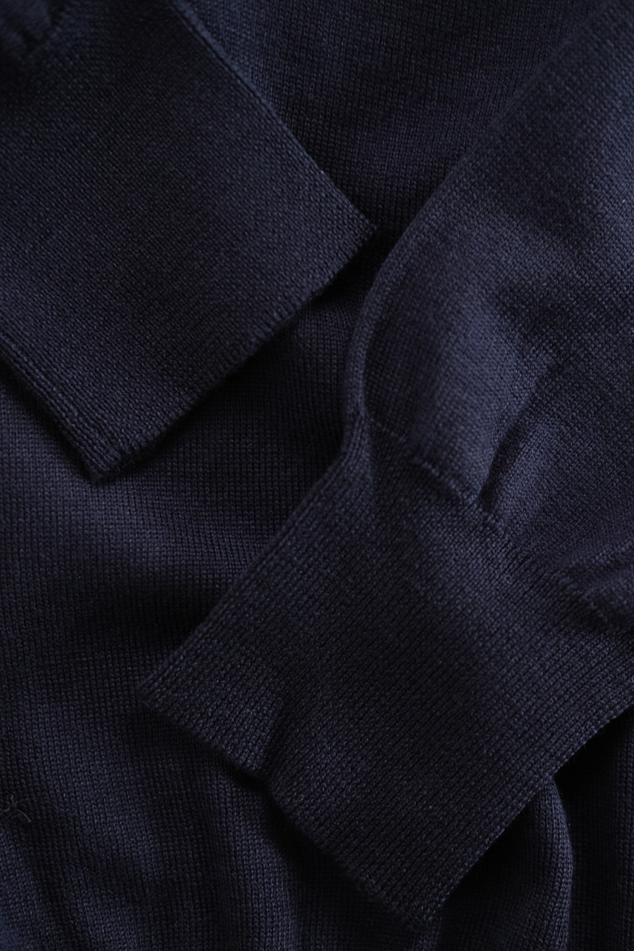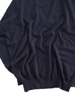 まず目を引くのは、素材の美しさ。用いられているのはメリノウールの中でも特に繊維の細い「エクストラファインメリノ」と呼ばれるクラスで、素肌に触れても驚くほど滑らか。通常のウールに比べて光沢が抑えられ、深いネイビーの色合いをより一層引き立てています。その編み地は非常に緻密で、毛羽立ちが少なく、ドレープ感も見事。袖を通した瞬間に体を包み込む軽やかさは、天然素材でありながらシルクやカシミヤを思わせるほどの上質なタッチです。