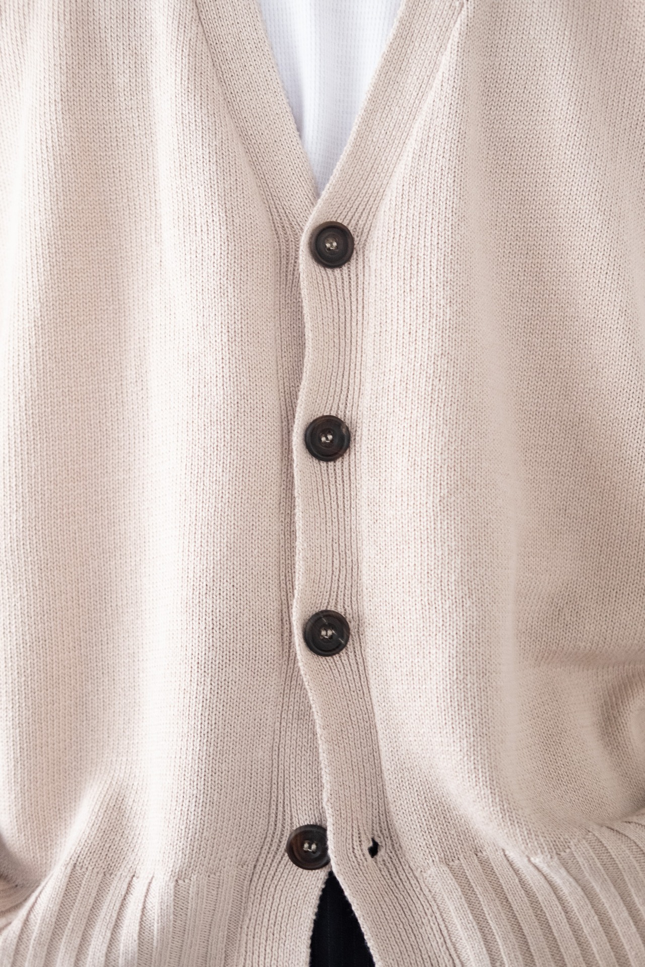 フロントは5ボタン仕様の深いVネック。Tシャツをインナーにすれば軽快に、シャツやタートルネックを差し込めば上品に、スタイリング次第で幅広く対応します。