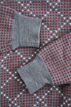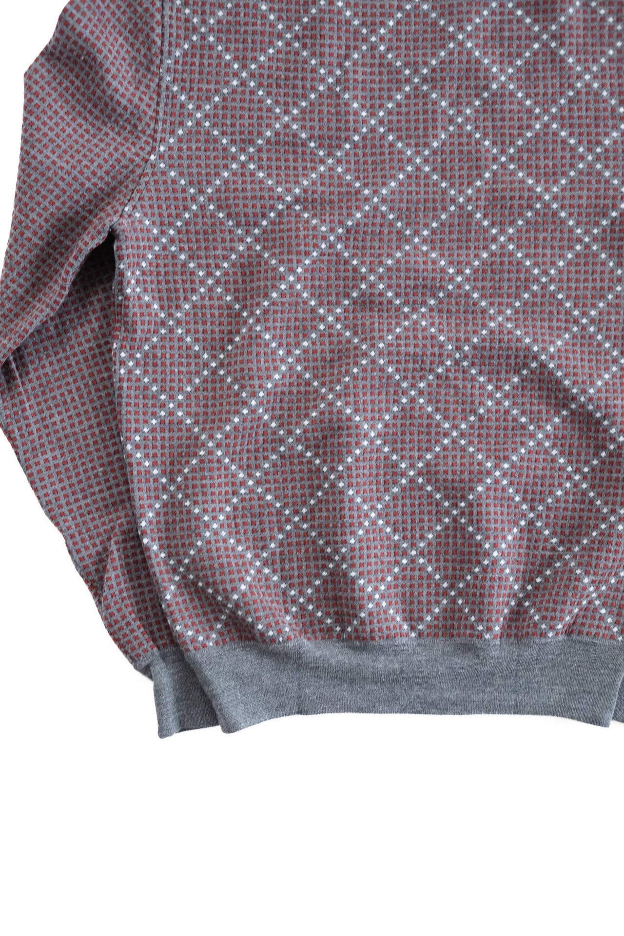 本作では赤、グレー、ネイビーの糸を組み合わせ、小さなドットを規則的に配列し、遠目にはダイヤ柄が浮かび上がるよう設計されています。