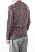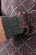 デザインは総柄でありながら上品に抑えられており、これもヴェロニク・ニシャニアンの美学を反映しています。クラシックなアーガイルやジオメトリックパターンを下敷きにしながらも、過剰な主張はなく、都会的で洗練された表情に仕上げられています。ボルドーを思わせる深い赤、知的なグレー、締め色のネイビーが織りなす配色は、落ち着きと存在感を同時に備え、合わせるボトムスを選びません。グレーのスラックスやネイビーのトラウザーズ、あるいはブラックデニムとも好相性です。