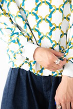 素材はコットン主体でありながら、プリントの発色と生地のハリが際立ちます。