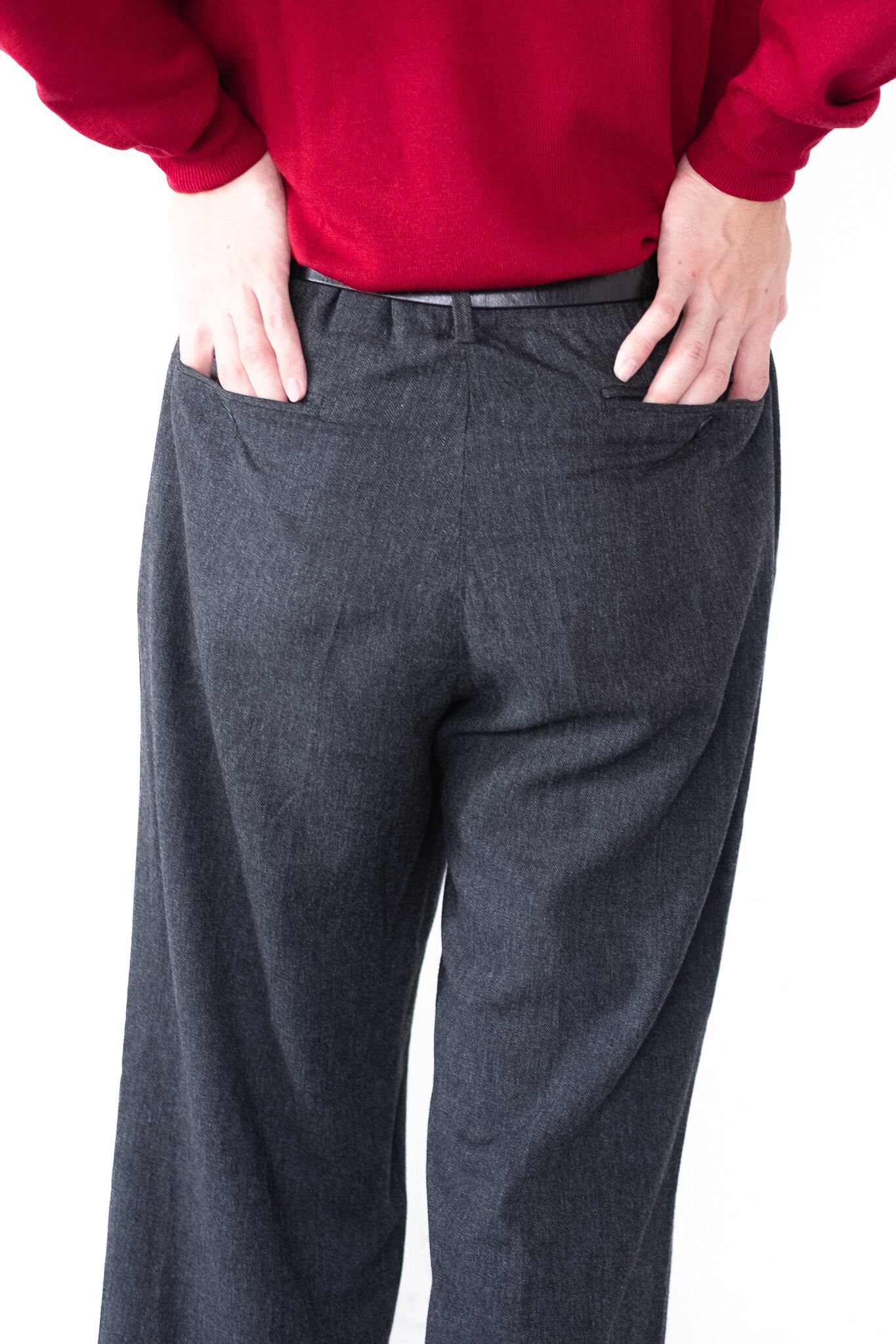 ここが最大の“ミソ”です。クラシックなアルマーニのスラックスといえば、深めの2タックで腰まわりにゆとりをもたせた設計が多い。