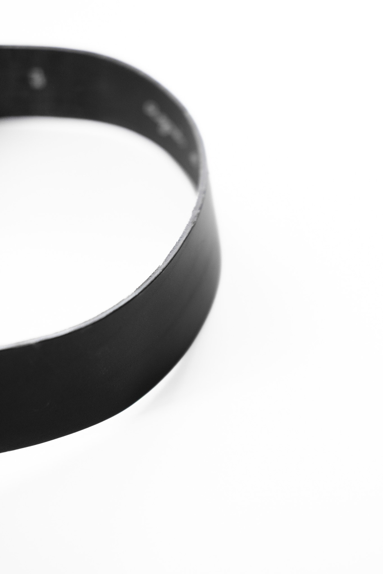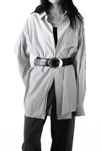 ブラックレザーのベルトに大ぶりの楕円バックルを組み合わせた、潔く大胆なデザイン。