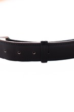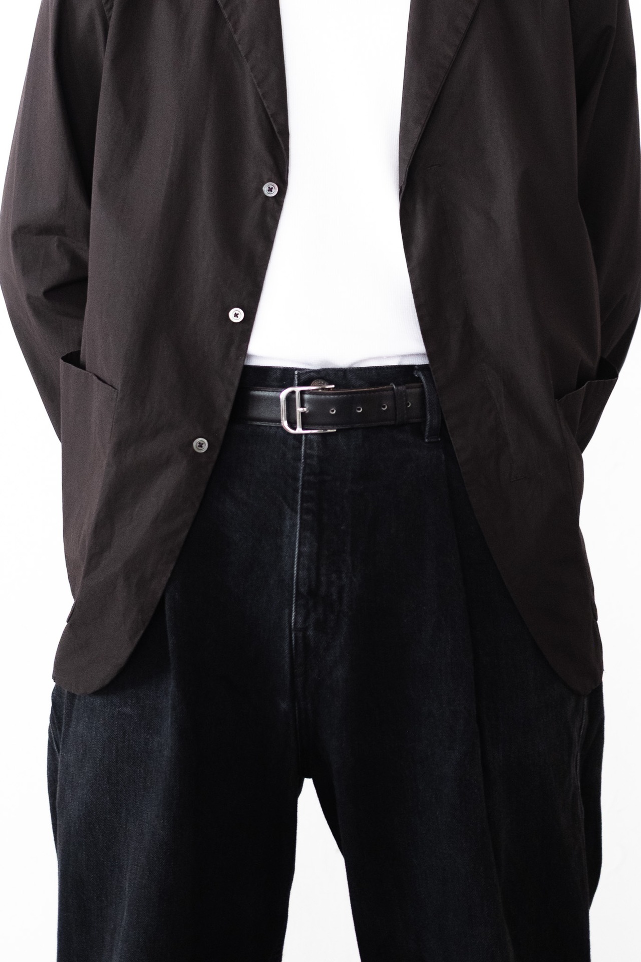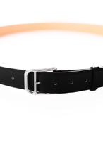 メンズのベルトとしては、30mm幅のシングルフェイス仕様。素材には張りのあるスムースカーフを採用し、光沢を抑えたマットなブラックがシックな存在感を放ちます。裏面にはナチュラルカラーのカーフライニングを用いており、堅牢さと柔らかさを兼ね備えた仕立て。