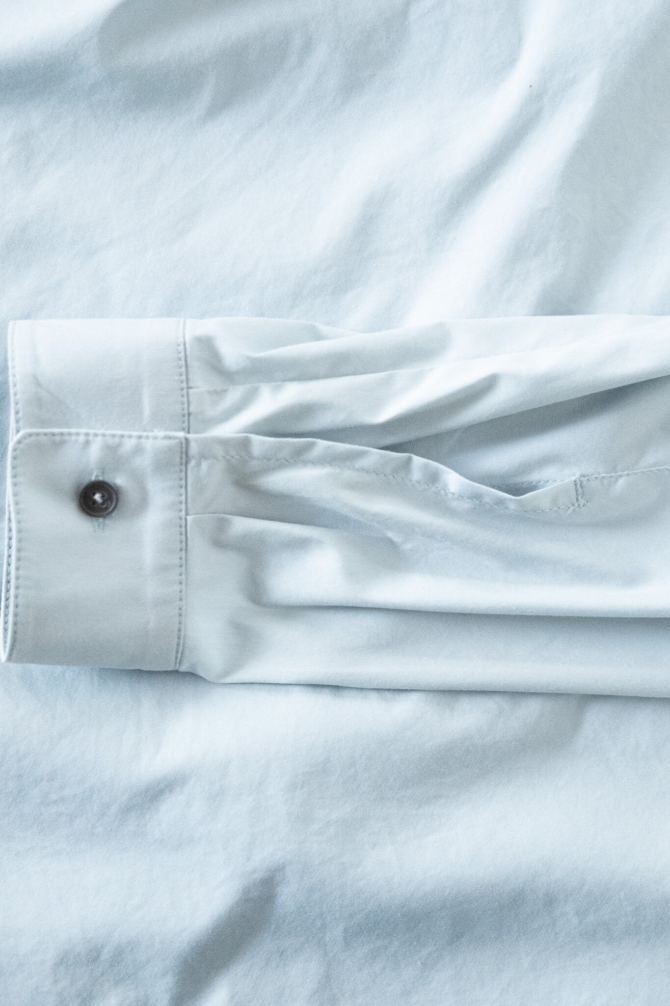 肩周りと袖には、運動性を高める立体的なパターン構成が見て取れ、ただのドレスシャツとは一線を画します。