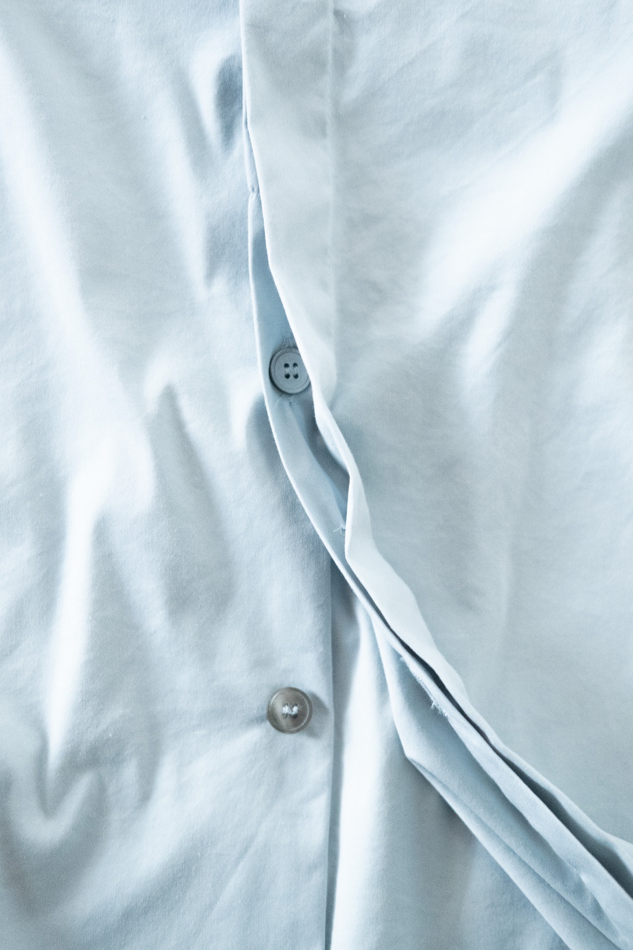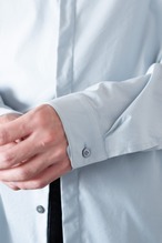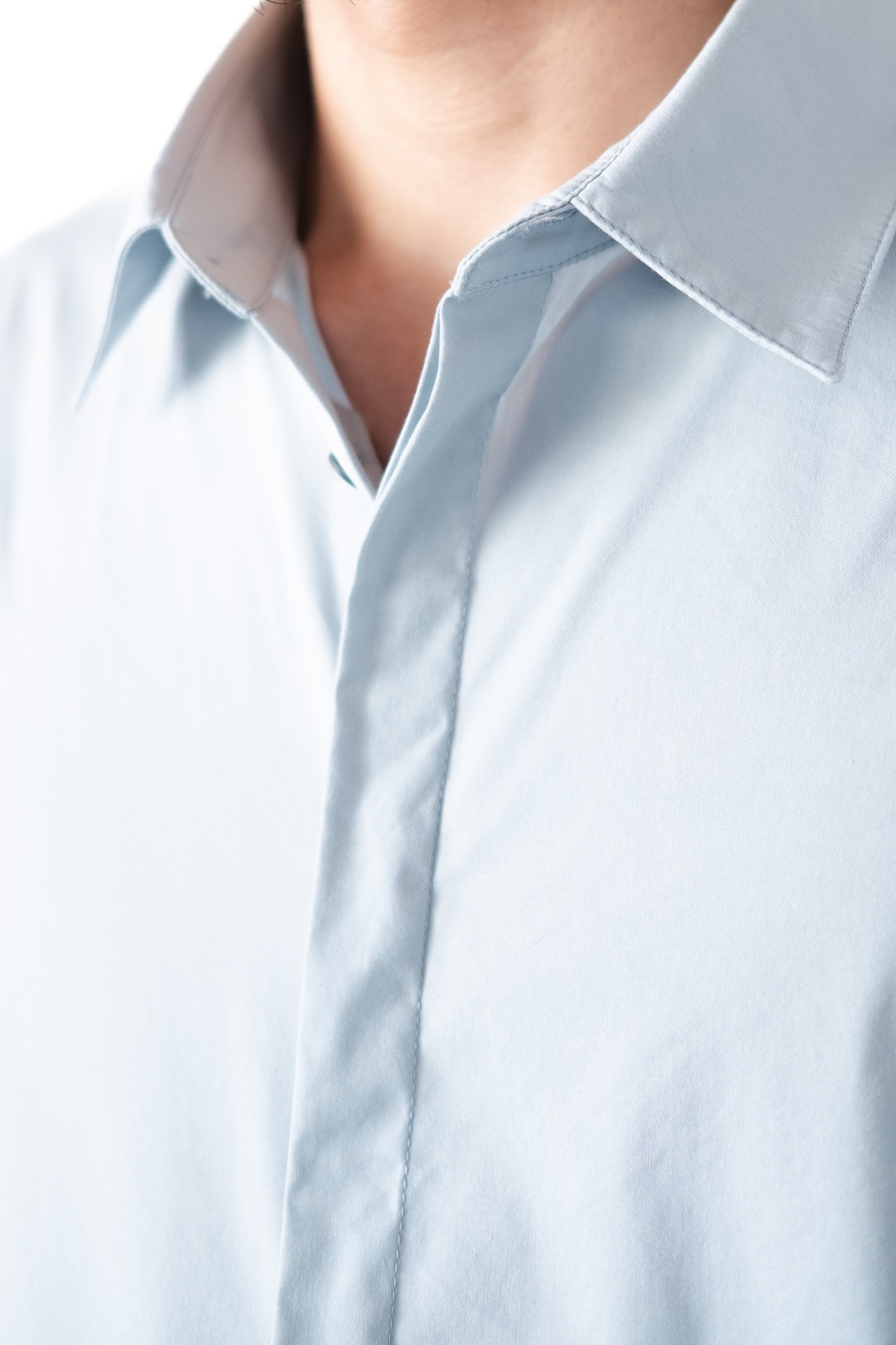 ボタンの視覚的情報を排除することで、シャツ全体の佇まいに“沈黙”が宿ります。