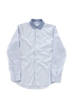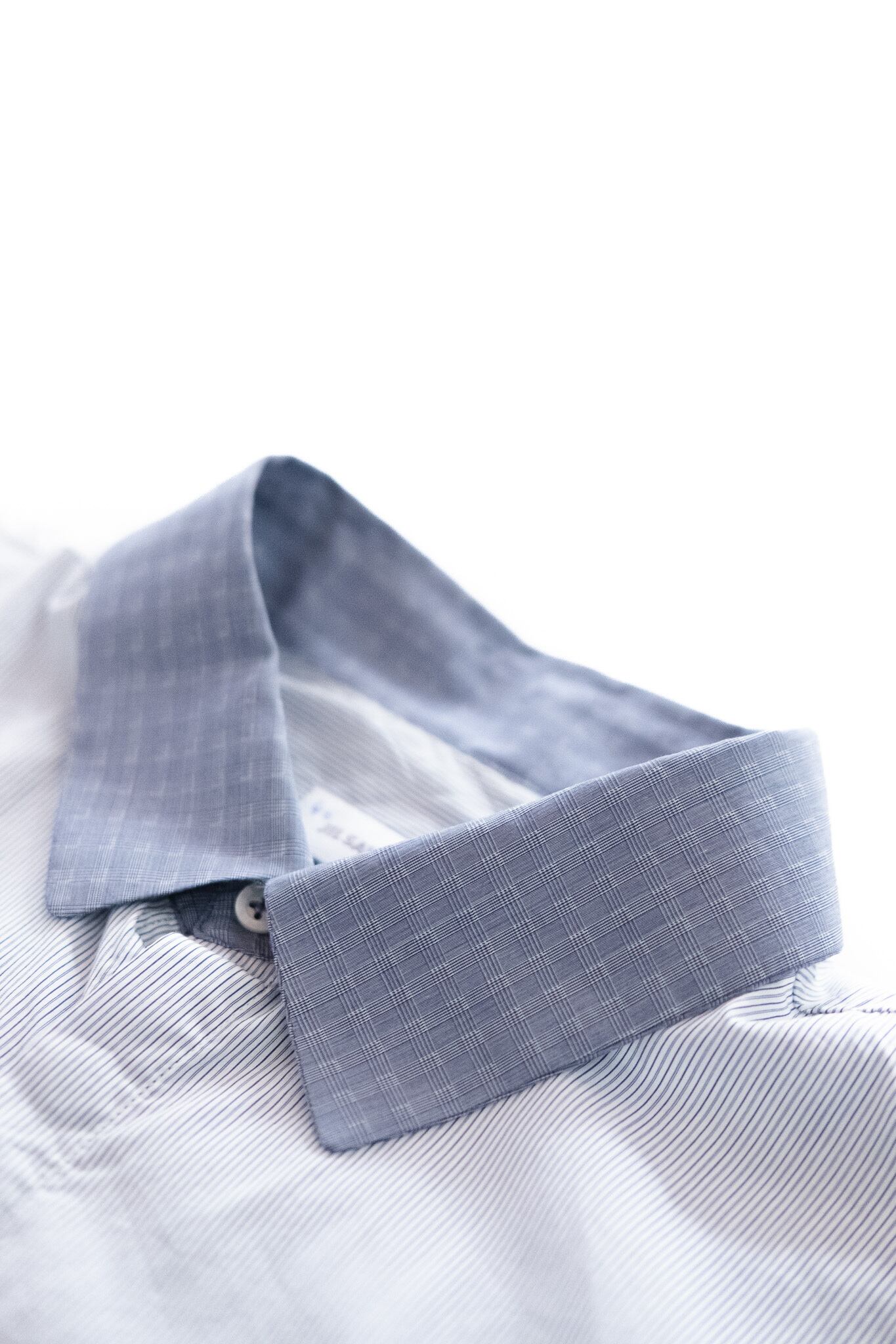 ストライプの身頃に対して、襟には格子柄の生地を切り替えとして配することで、慎ましくも知的なコントラストを生んでいます。