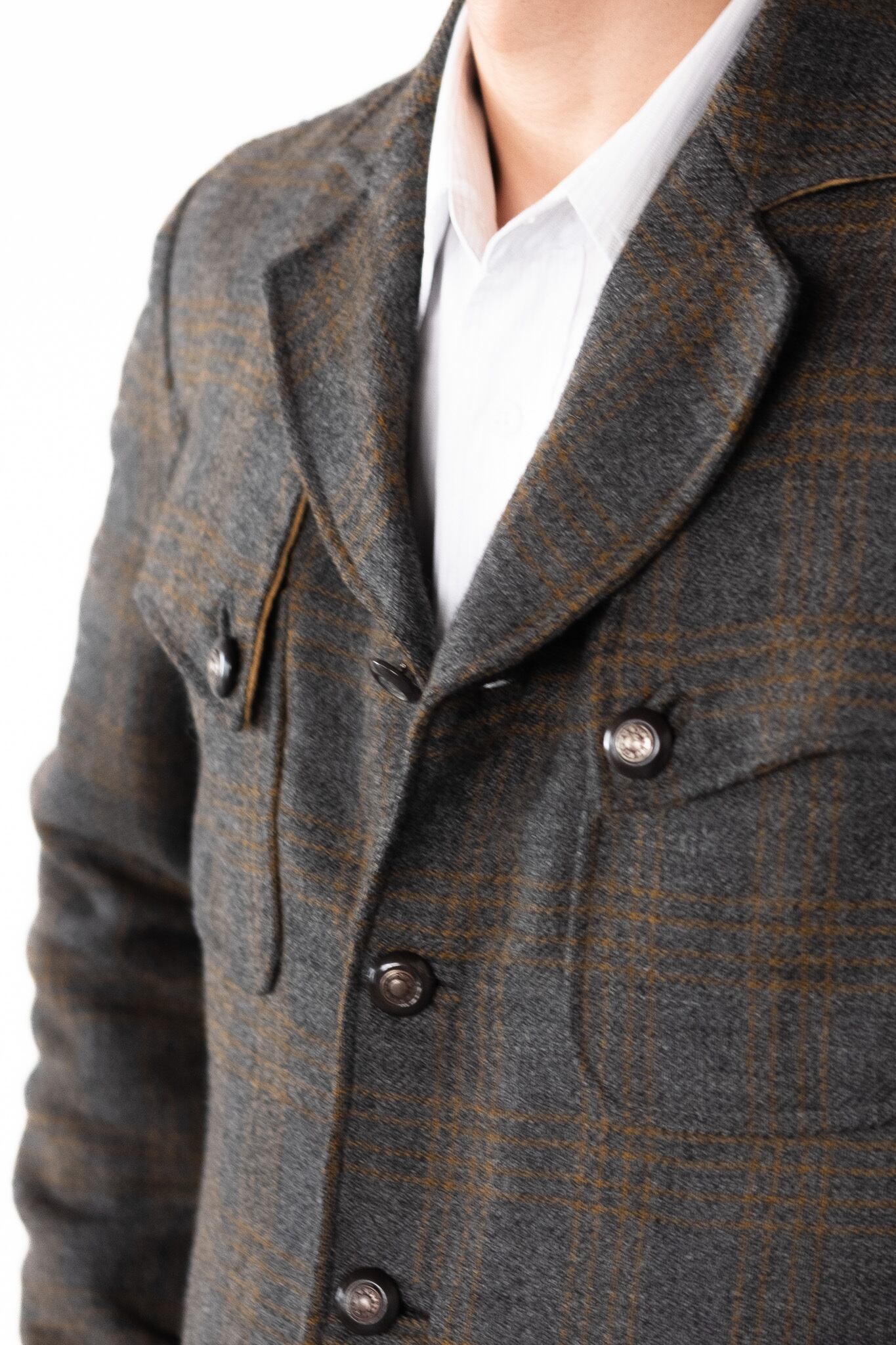 グレーをベースにマスタードとレンガ色を走らせたチェックツイードは、英国的な武骨さを備えつつも、どこか軽快で洗練された色彩感覚を持つ。