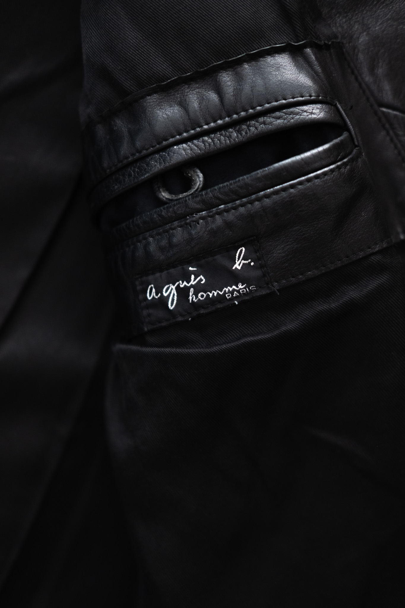 agnès b. の定番であるカーディガンプレッションやストライプシャツが「軽快さ」や「親しみやすさ」を象徴するアイテムであるのに対し、このカーフレザージャケットはブランドの中で異彩を放つ存在。