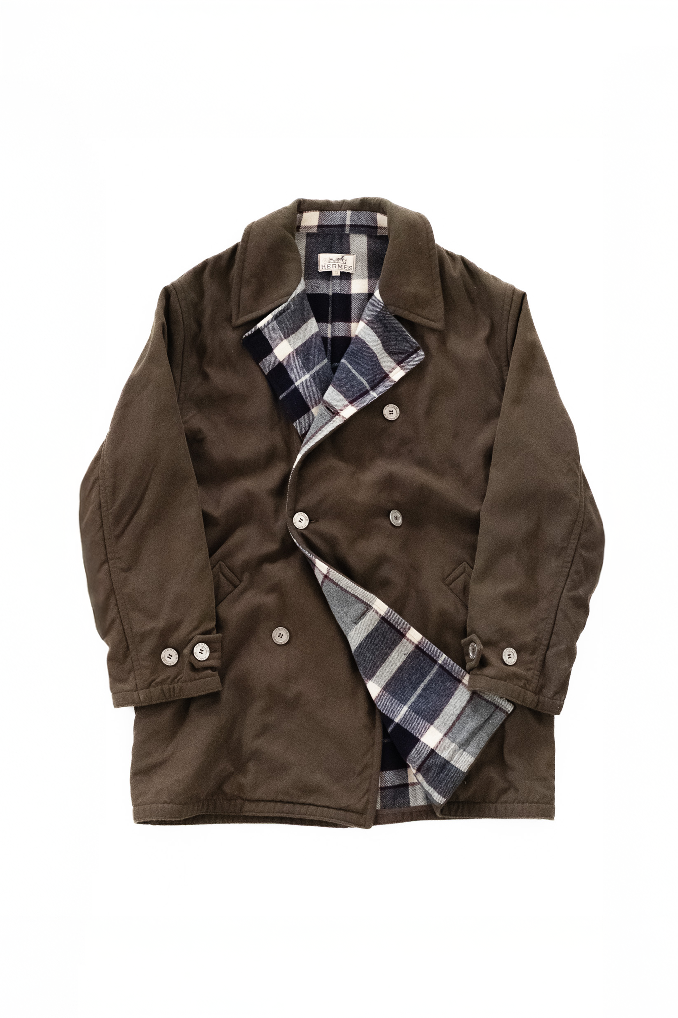 [1998-2002] “HERMÈS SPORT” Cotton Canvas Double-Breasted Short Coat with Wool Check Lining (Designed by Véronique Nichanian)