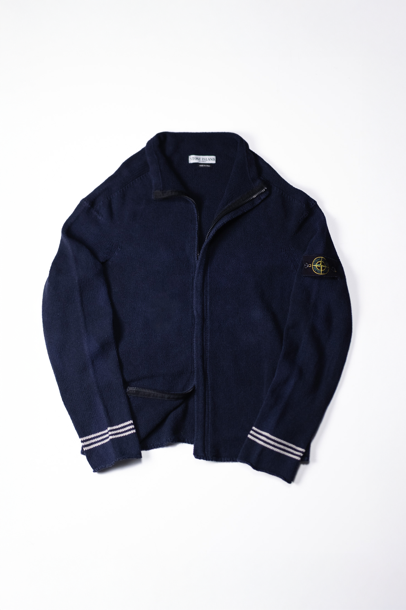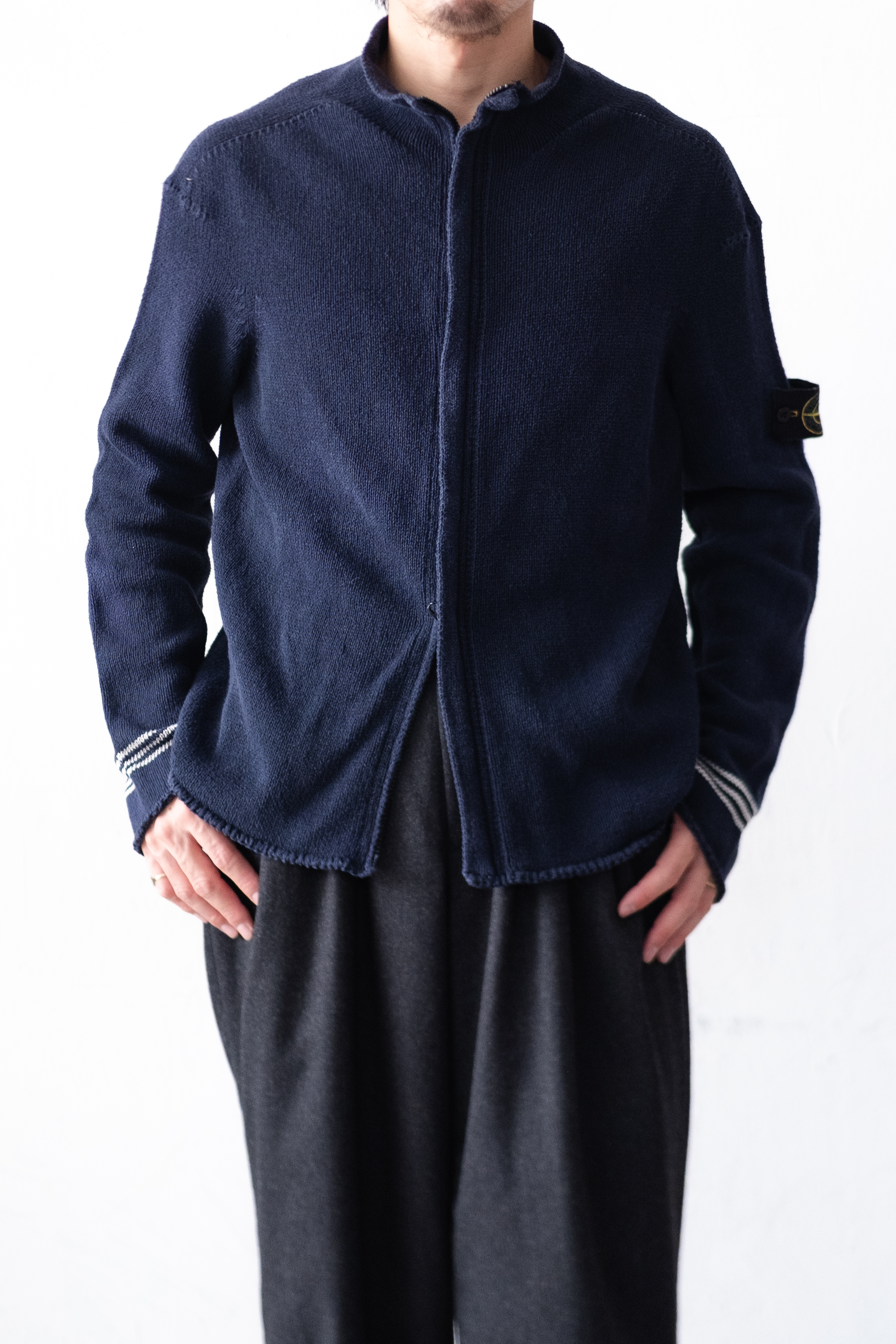 この時期のStone Islandでは、ナイロンやレザーと並行して「コットンニット」を都市機能服の一形態として再解釈しており、