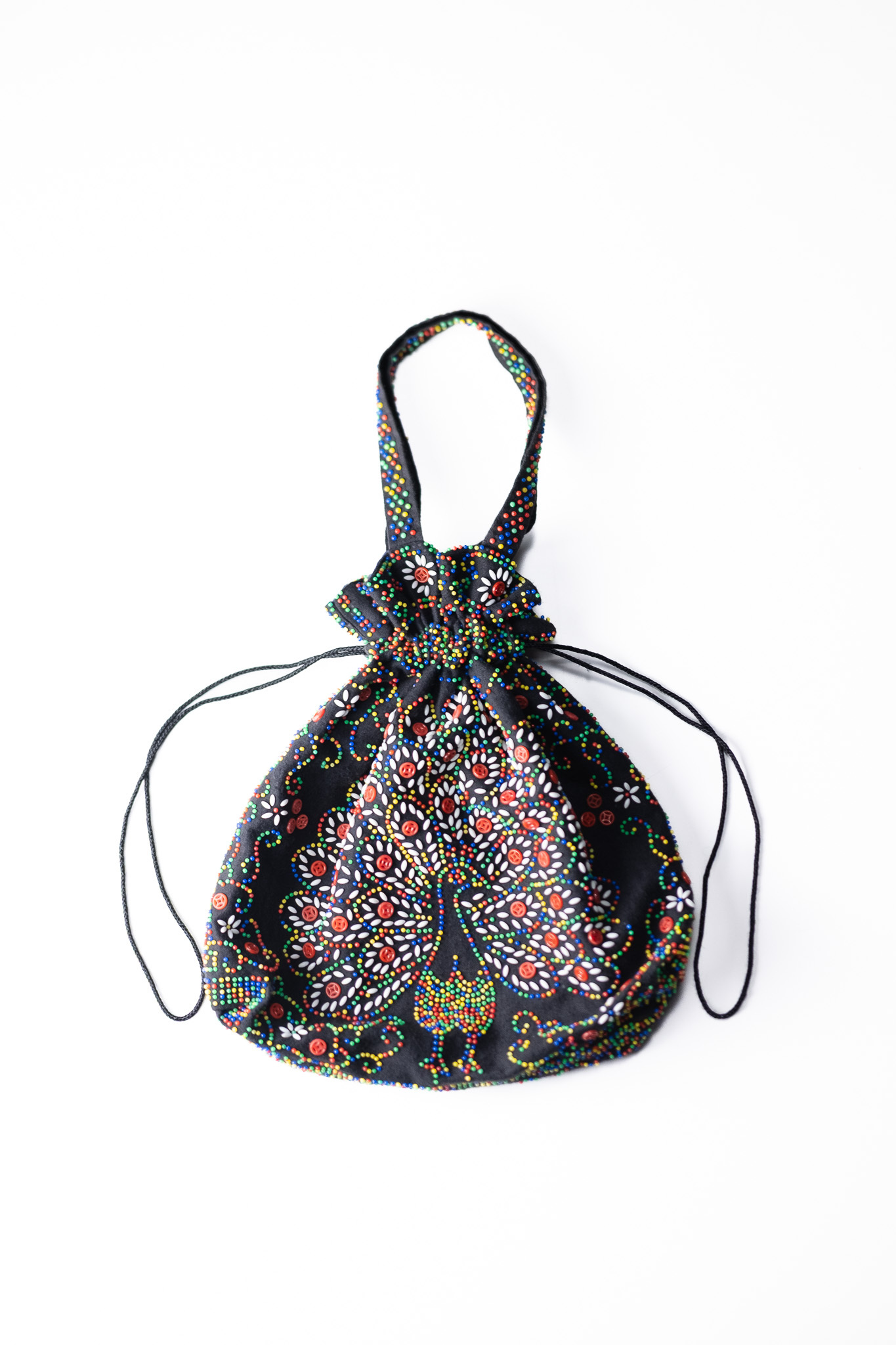 巾着の開口部を絞ると、ふっくらとしたフォルムが生まれ、ハンドル部分までびっしりとビーズ刺繍が施された贅沢なつくり。
