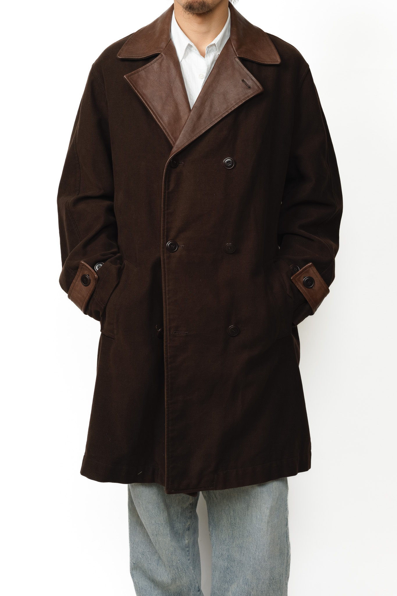 [Mid 1990’s] “ROMEO GIGLI” Cotton Piqué Coat with Aniline Goatskin Collar & Facing (made in Italy)