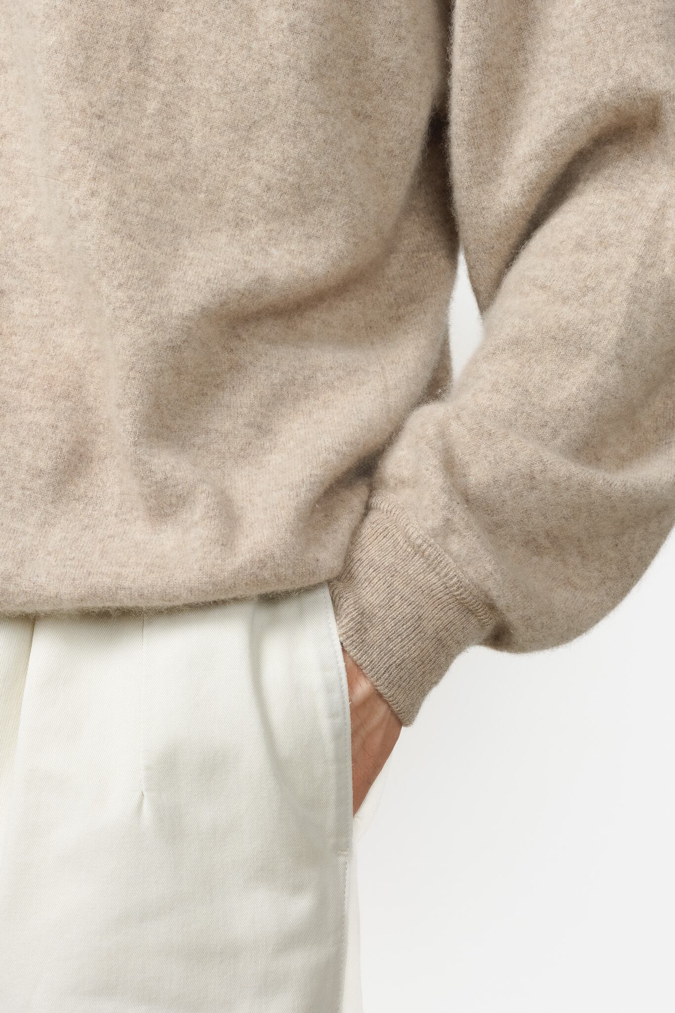 この一着では編み機のゲージをやや細かく設定し、繊維の光沢と密度を最大限に引き出しているのが特徴。