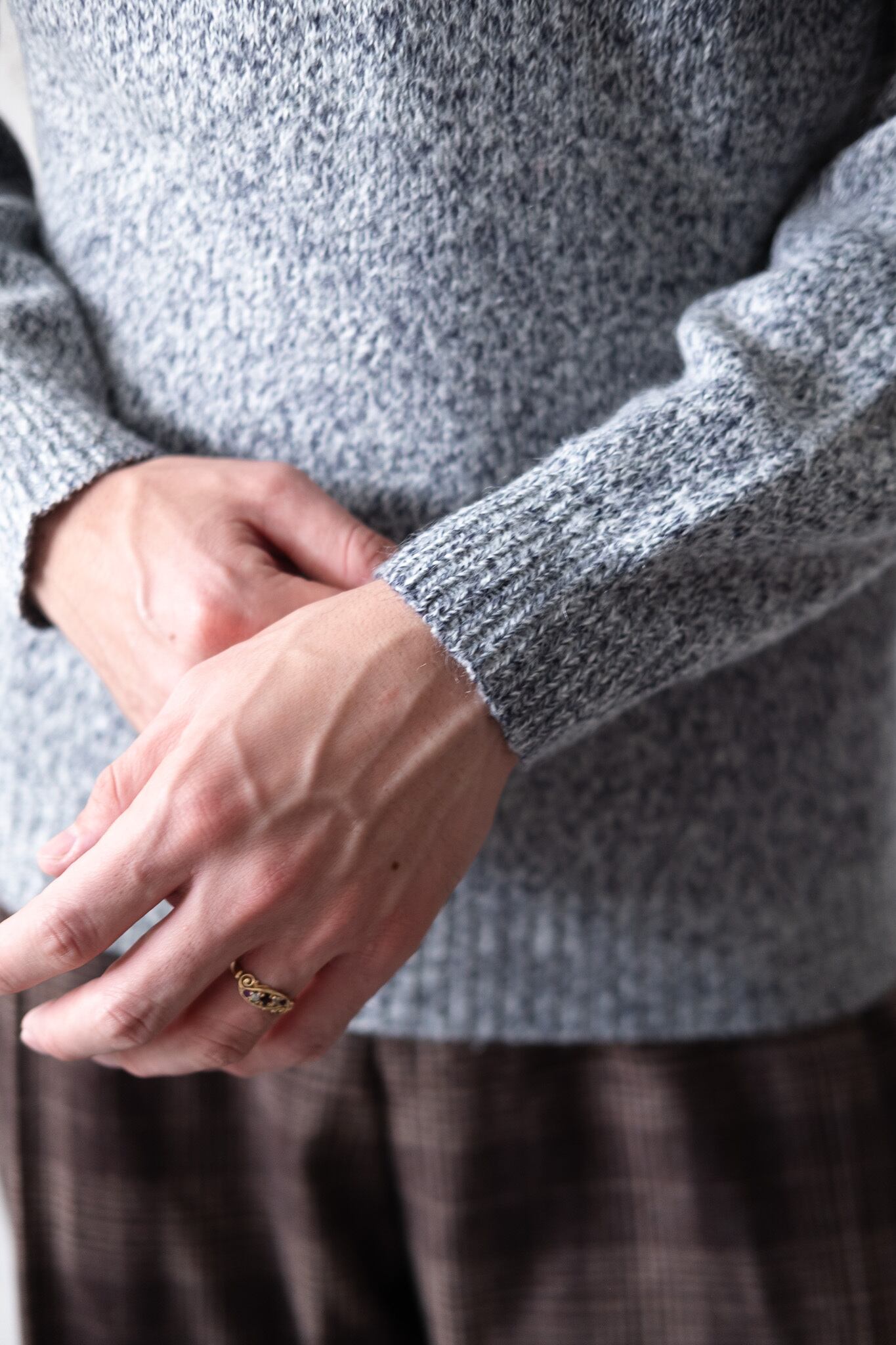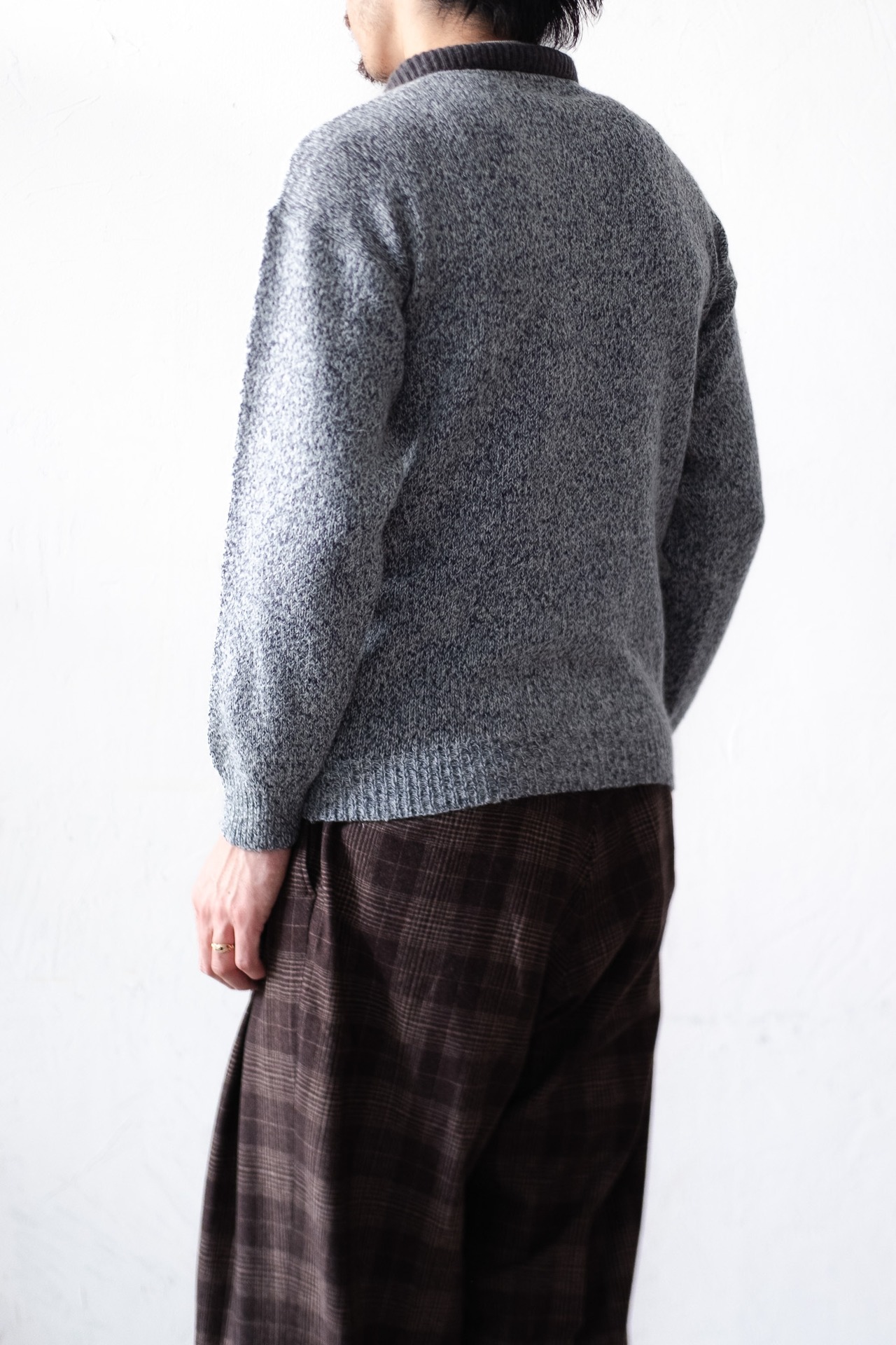 ミックスヤーンによる杢調のグレーは、光の当たり方によって奥行きが変化します。単色では生まれ得ない柔らかな陰影が魅力です。