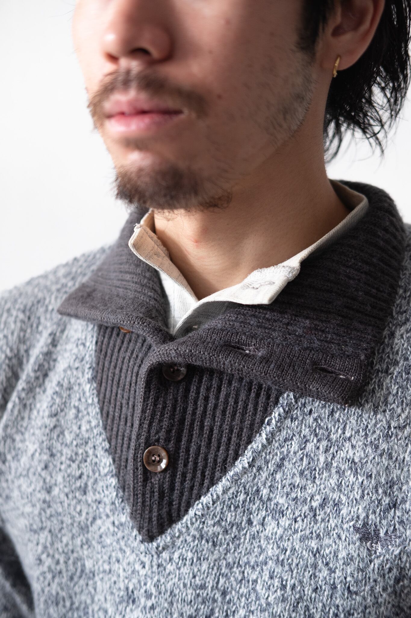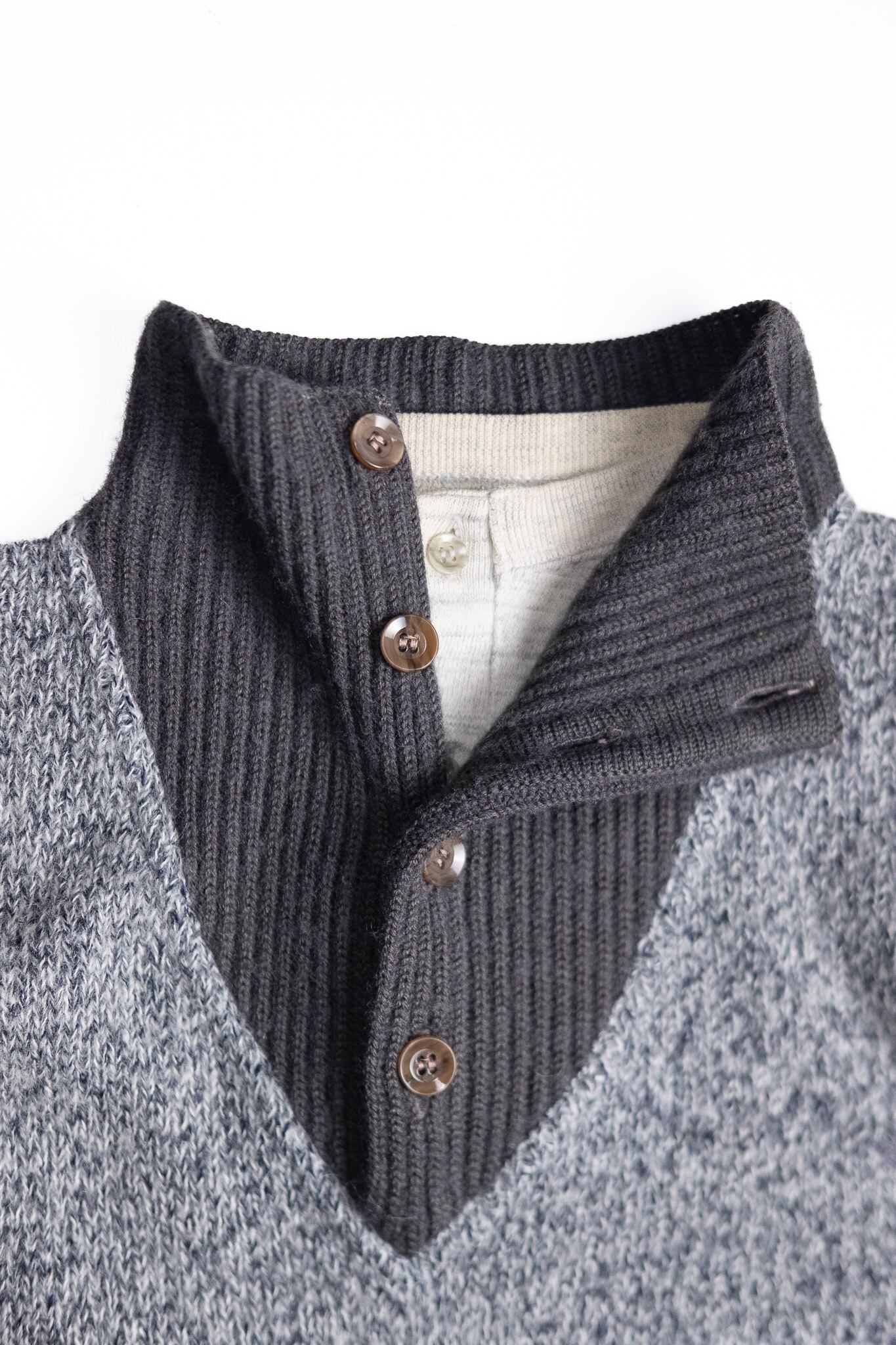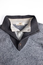 見ためはヘンリーネックのウェアに、太リブのニット襟を重ねたレイヤードスタイル。ところが実際にはすべて一体で構成されています。