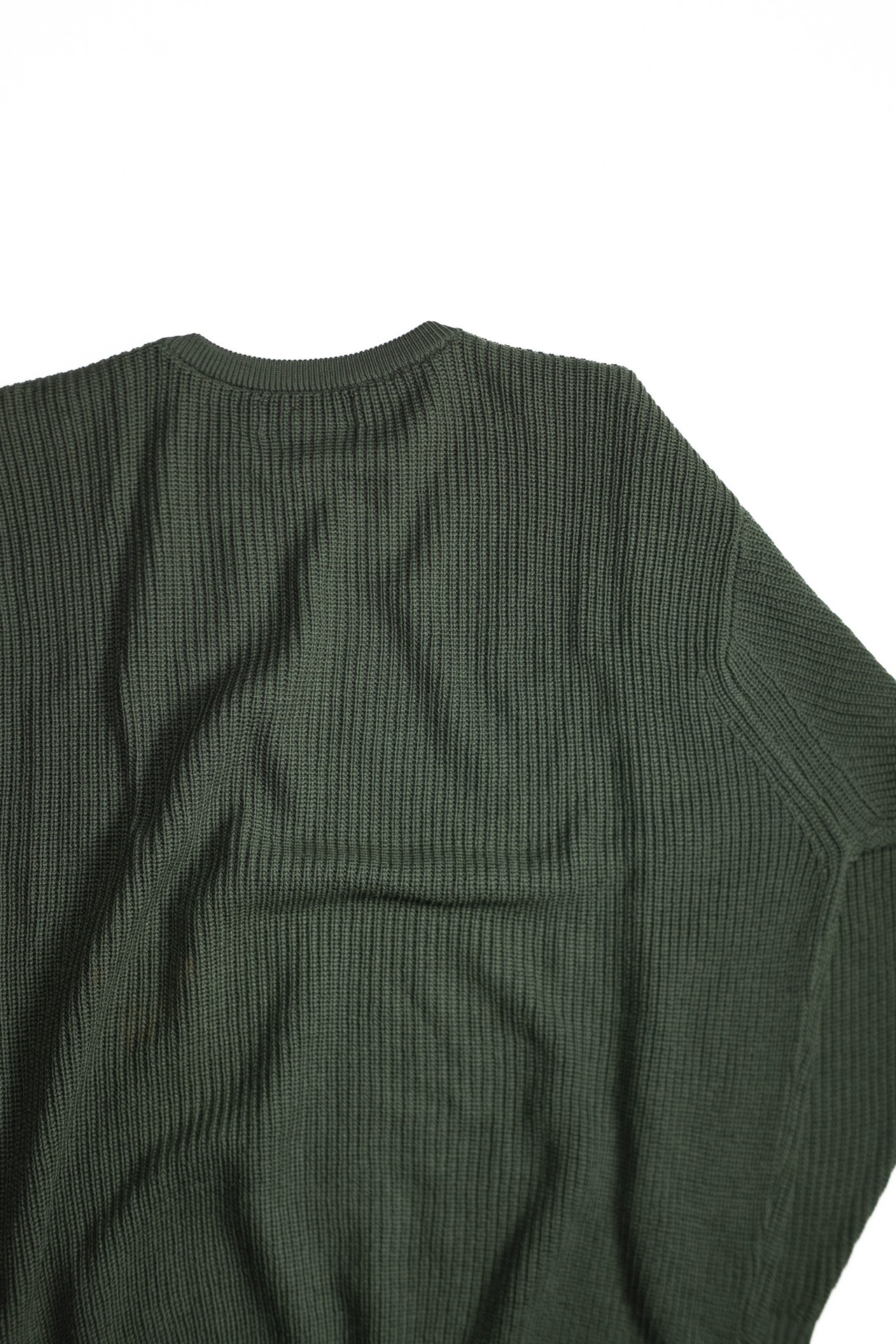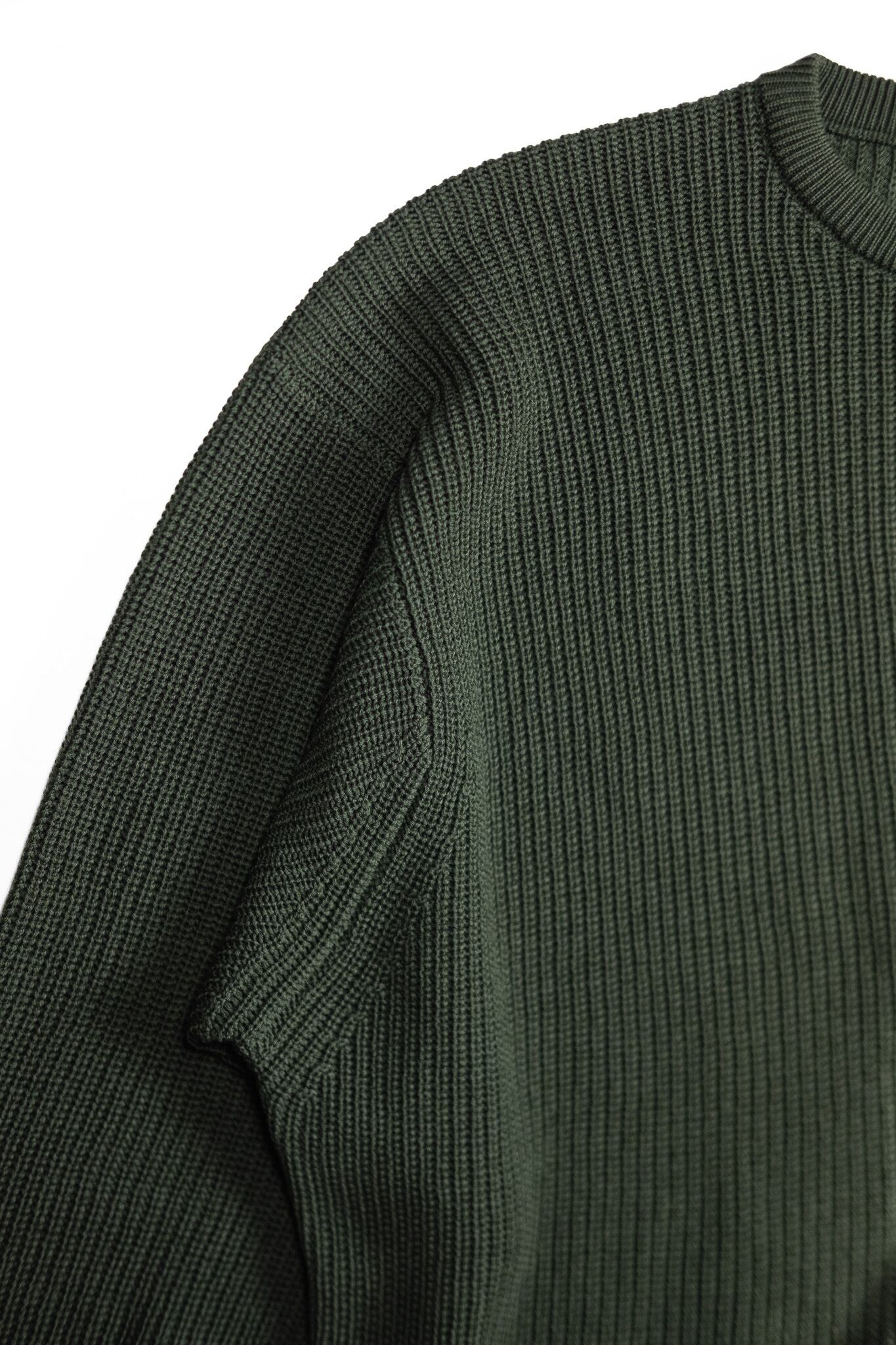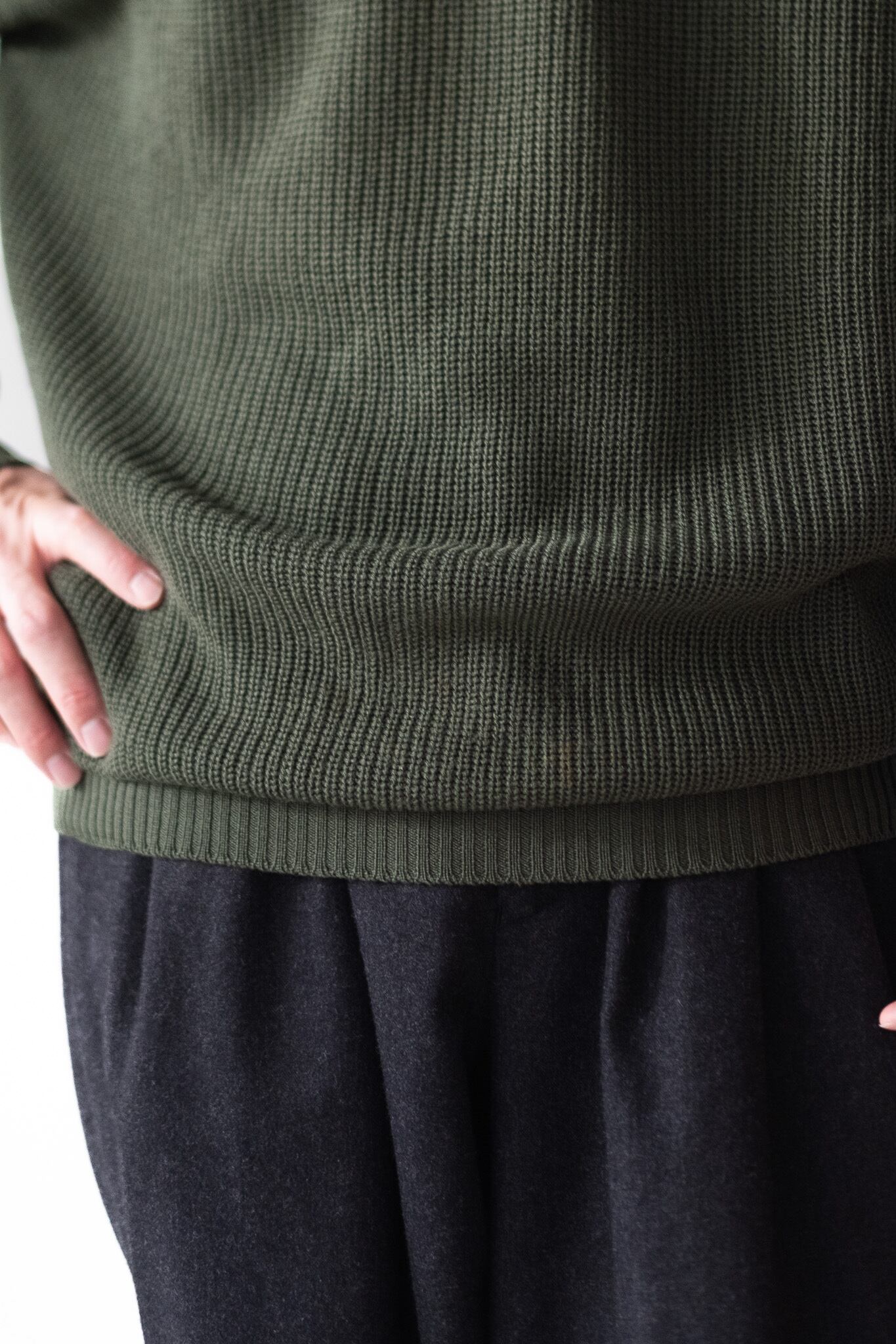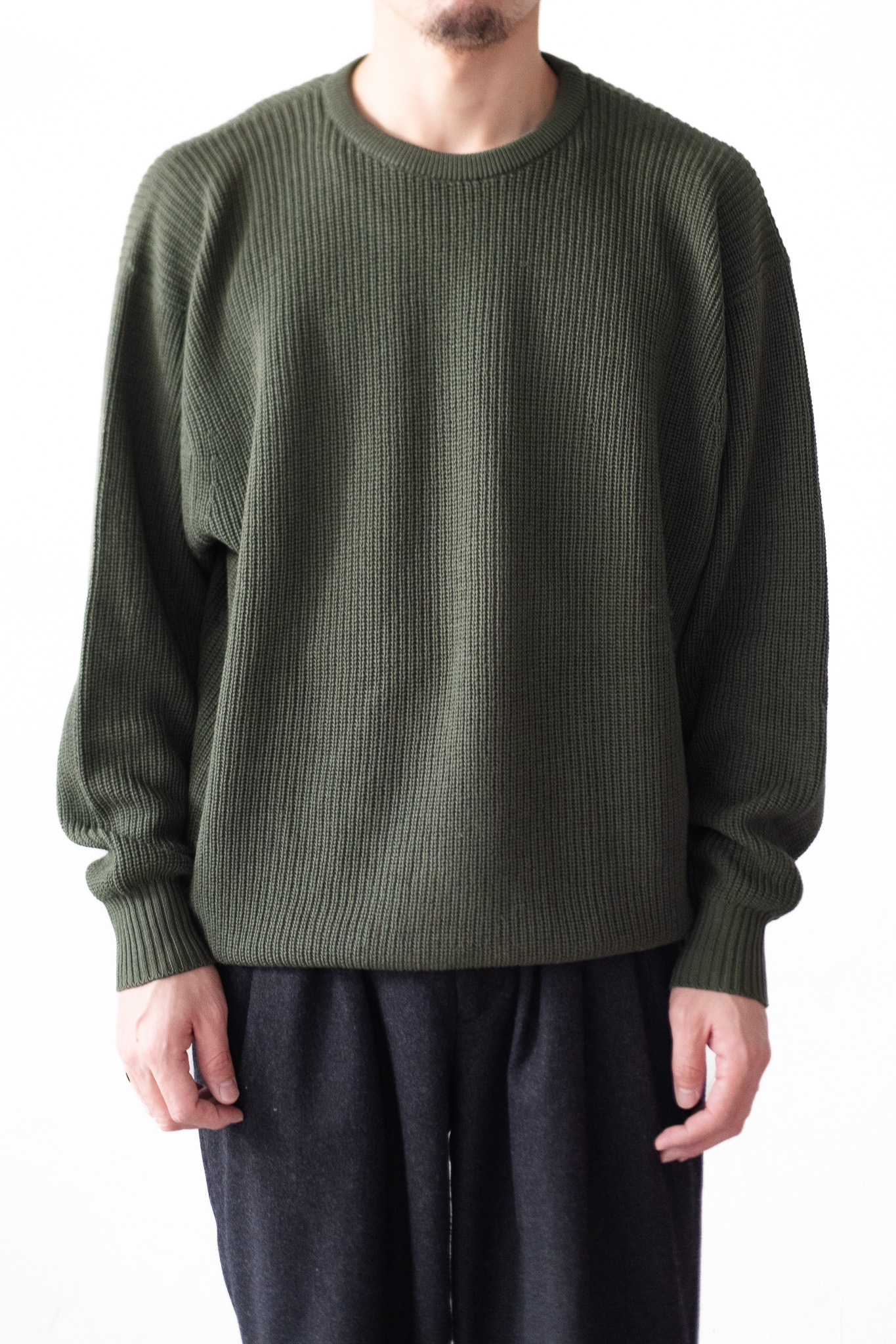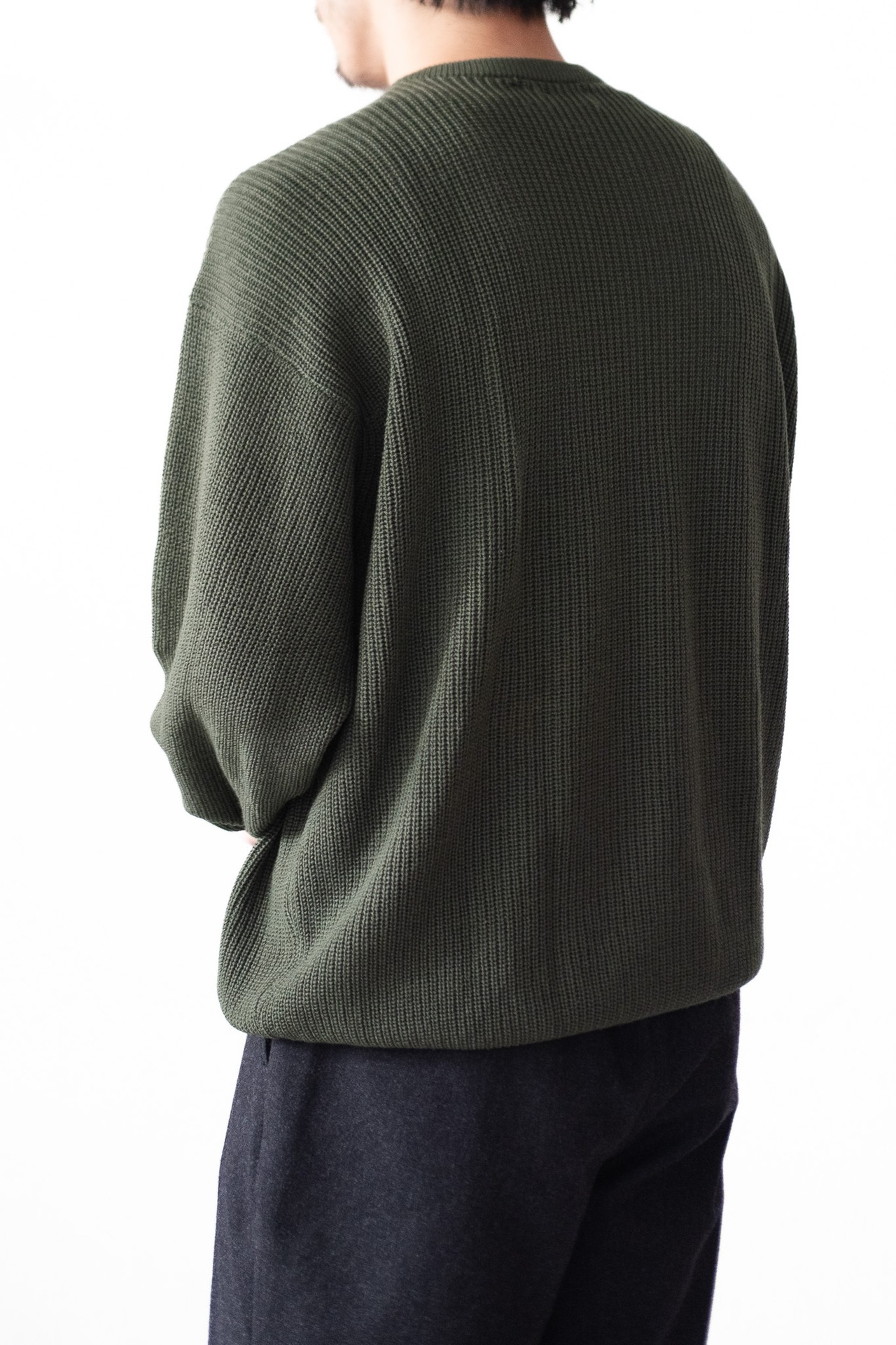 体から少し離れる空気感がありながら、だらしない印象にならない。着た瞬間に感じる「余裕と端正さの両立」が、このニットの完成度を物語っています。