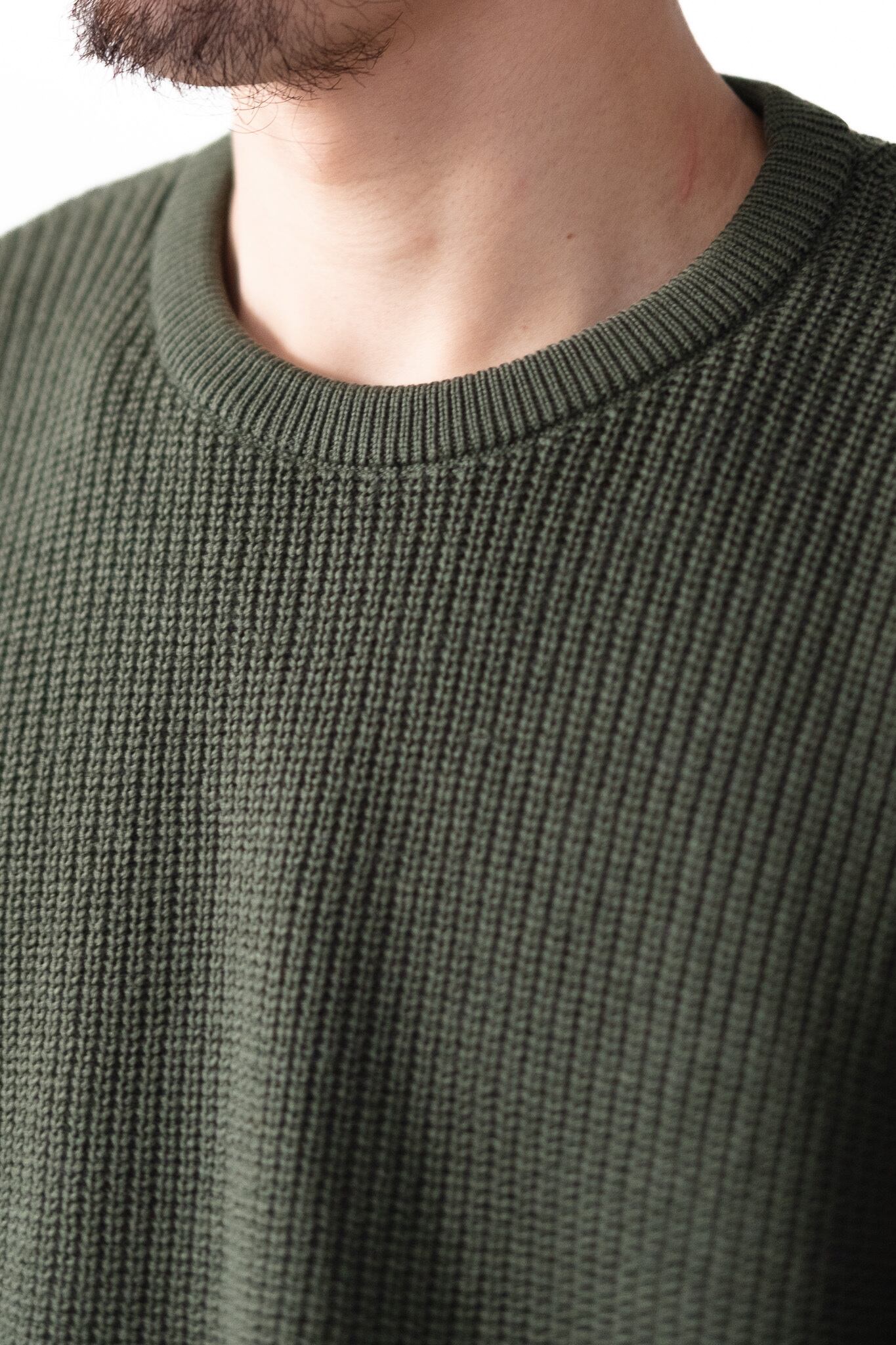 立体的な畝が生まれるこの編み組織は、空気層を多く抱え込み、非常に高い保温性をもたらします。