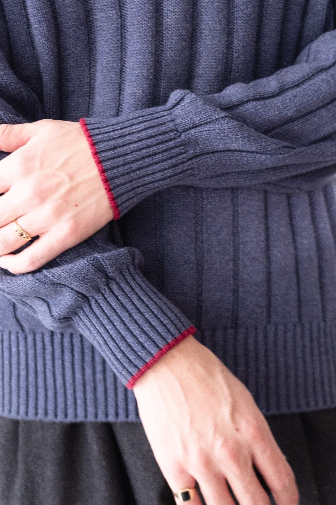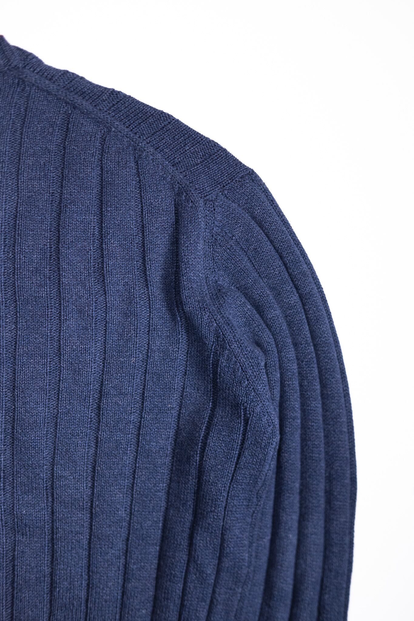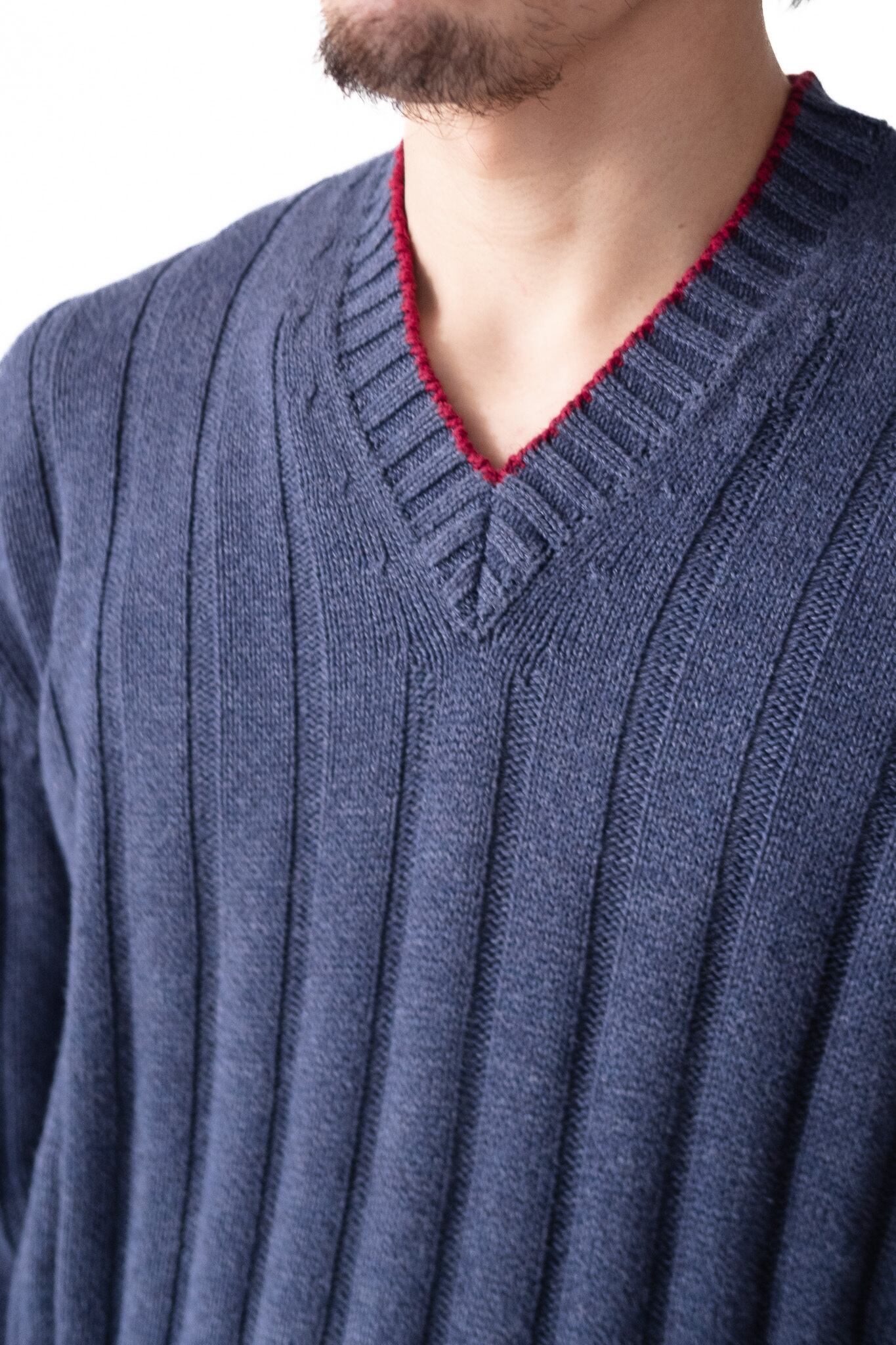 Vネックの構造、太リブの厚み、リズムのある編み目——