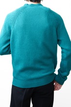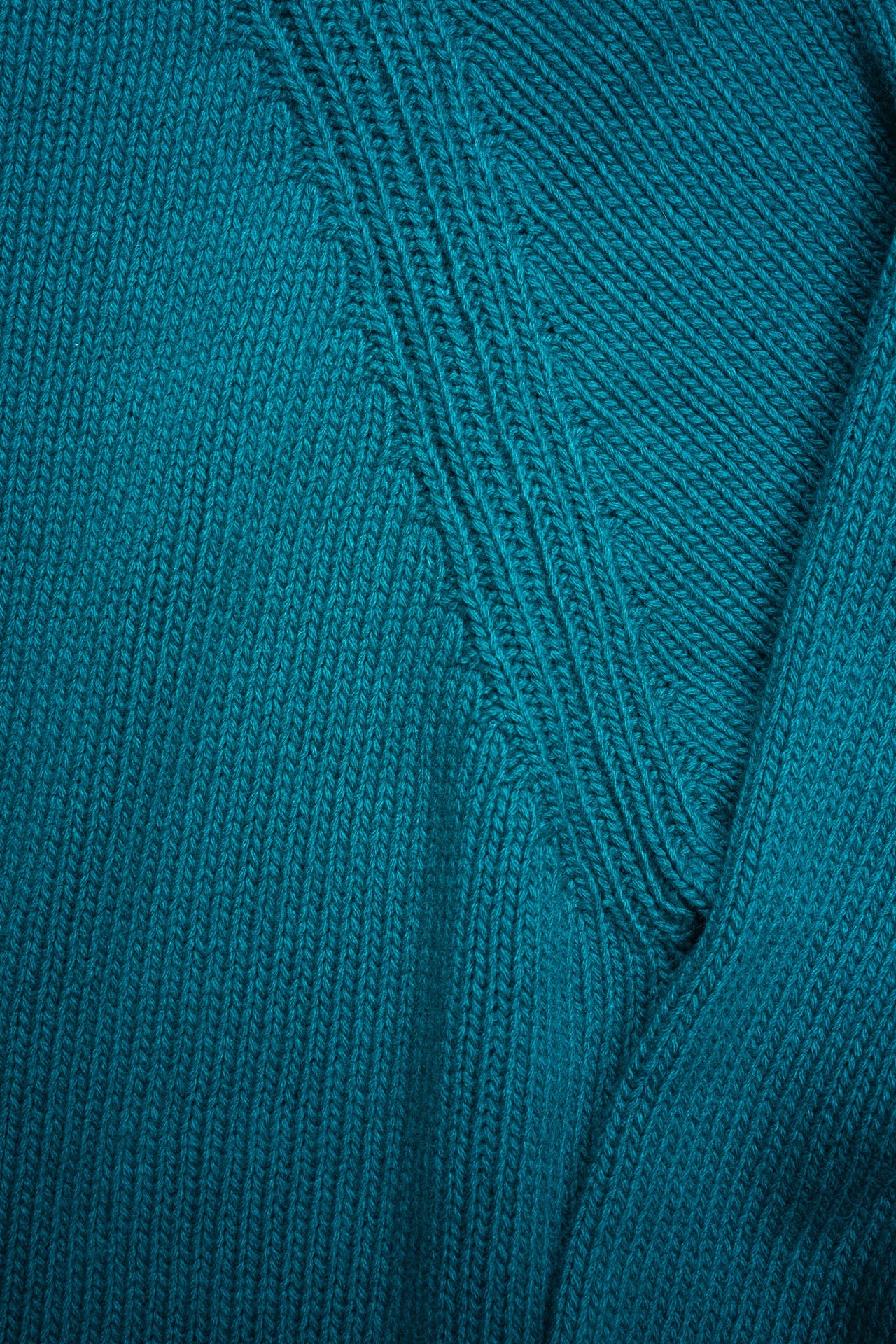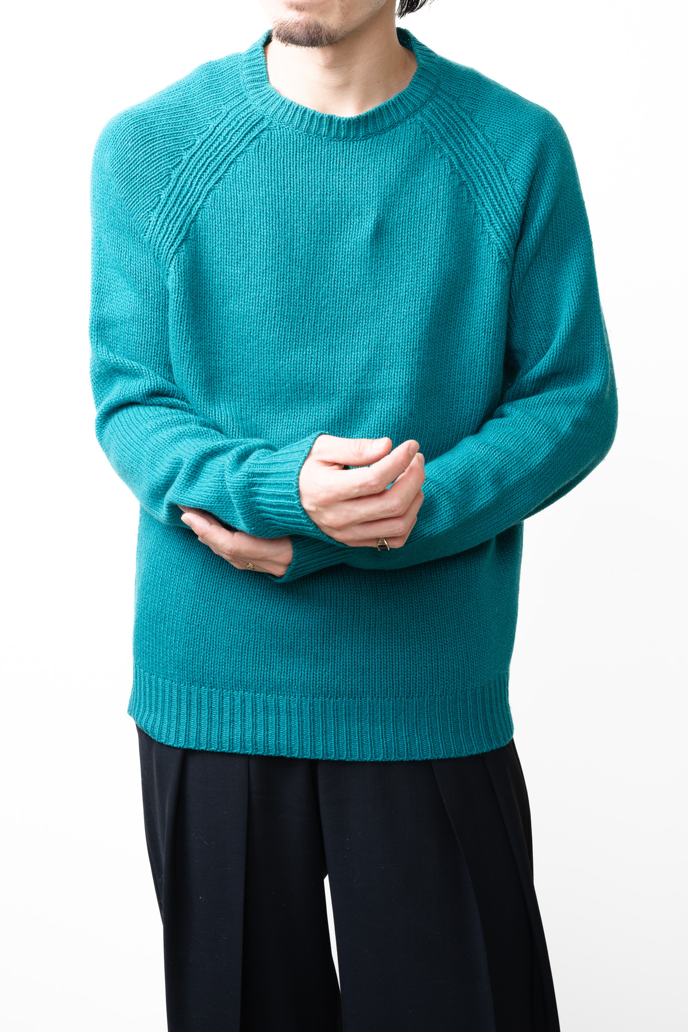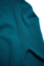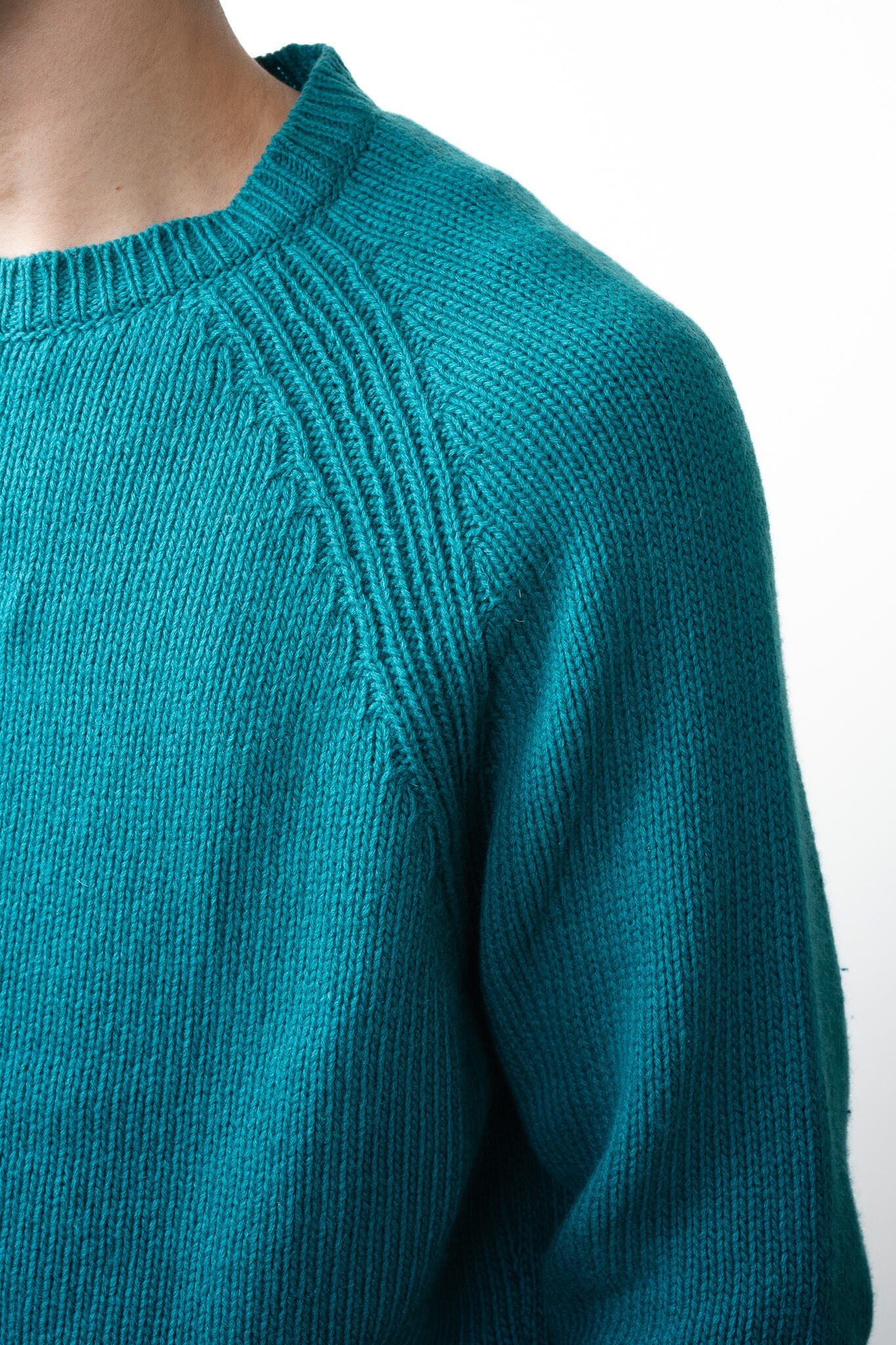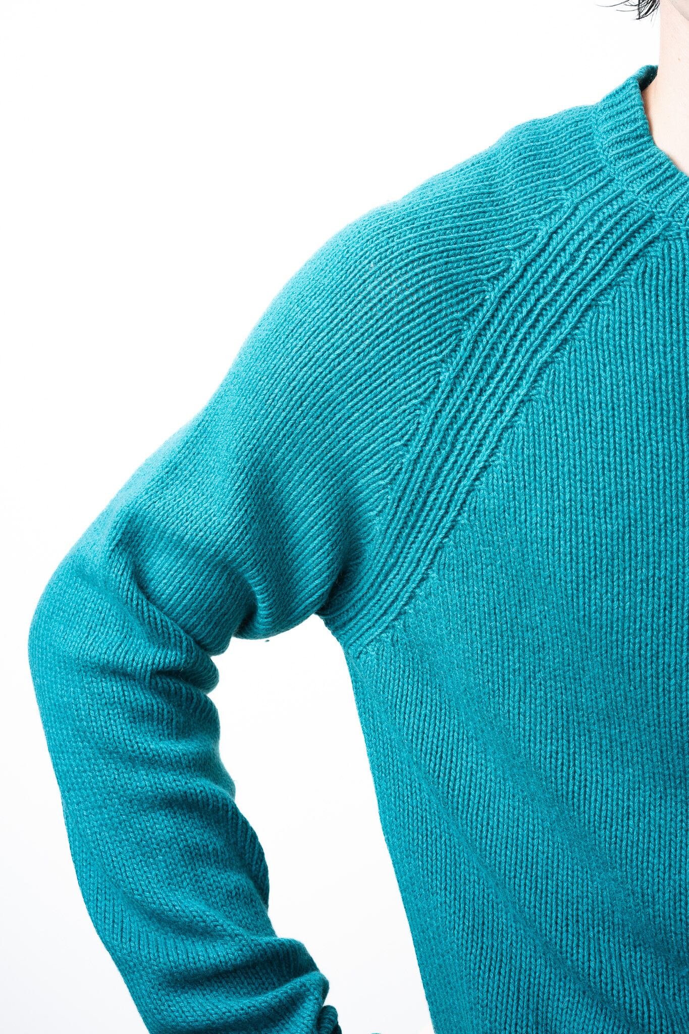 編み構造はラグランスリーブ仕様。肩から袖にかけて緻密に計算された減らし目が走り、縫い合わせではなく編みそのものの密度変化で立体的なラインを形成しています。