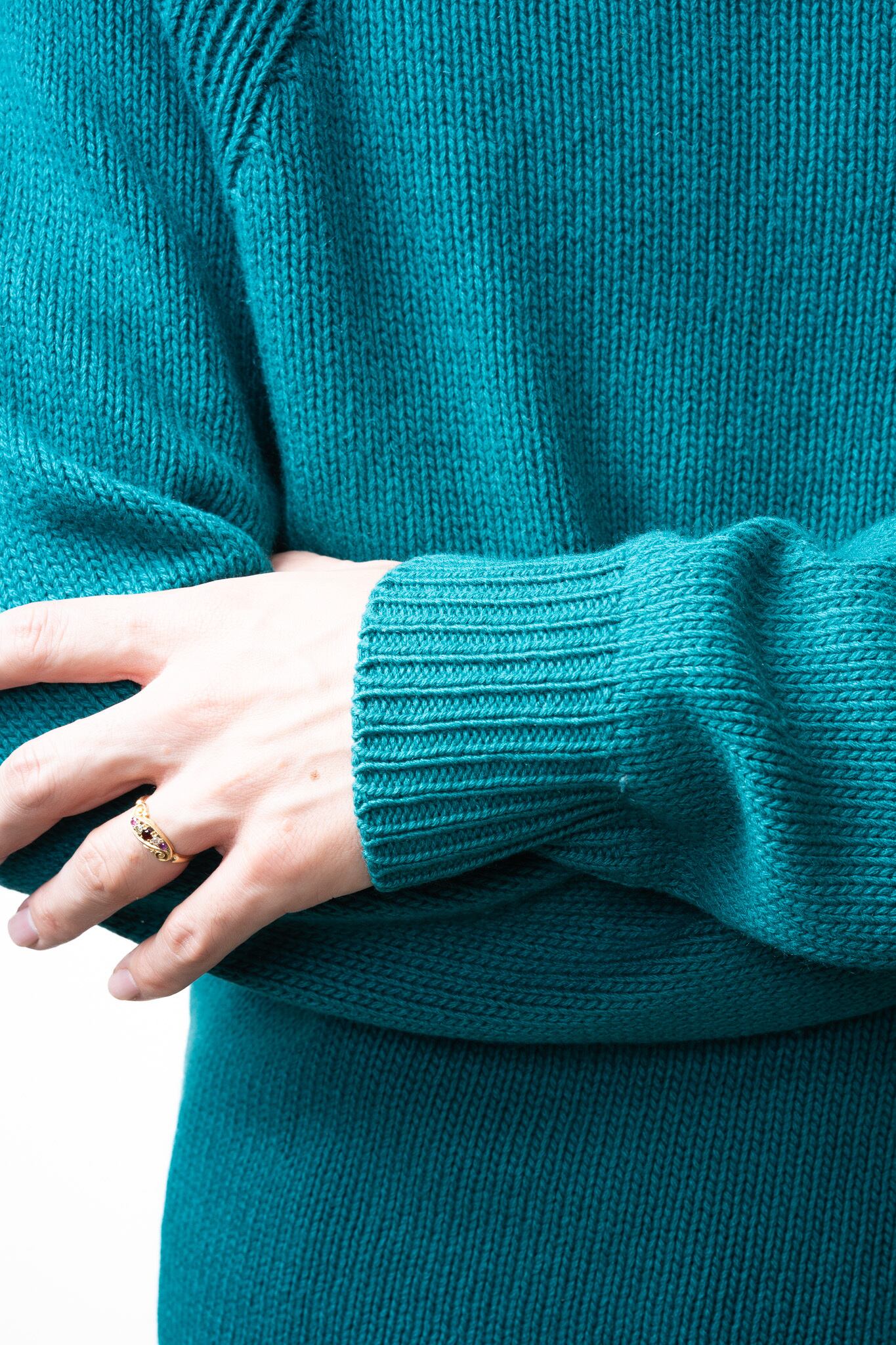 深く沈むようなグリーンの色調、完璧なテンションで編み上げられたフルファッション構造、そしてカシミヤが放つ自然な艶。