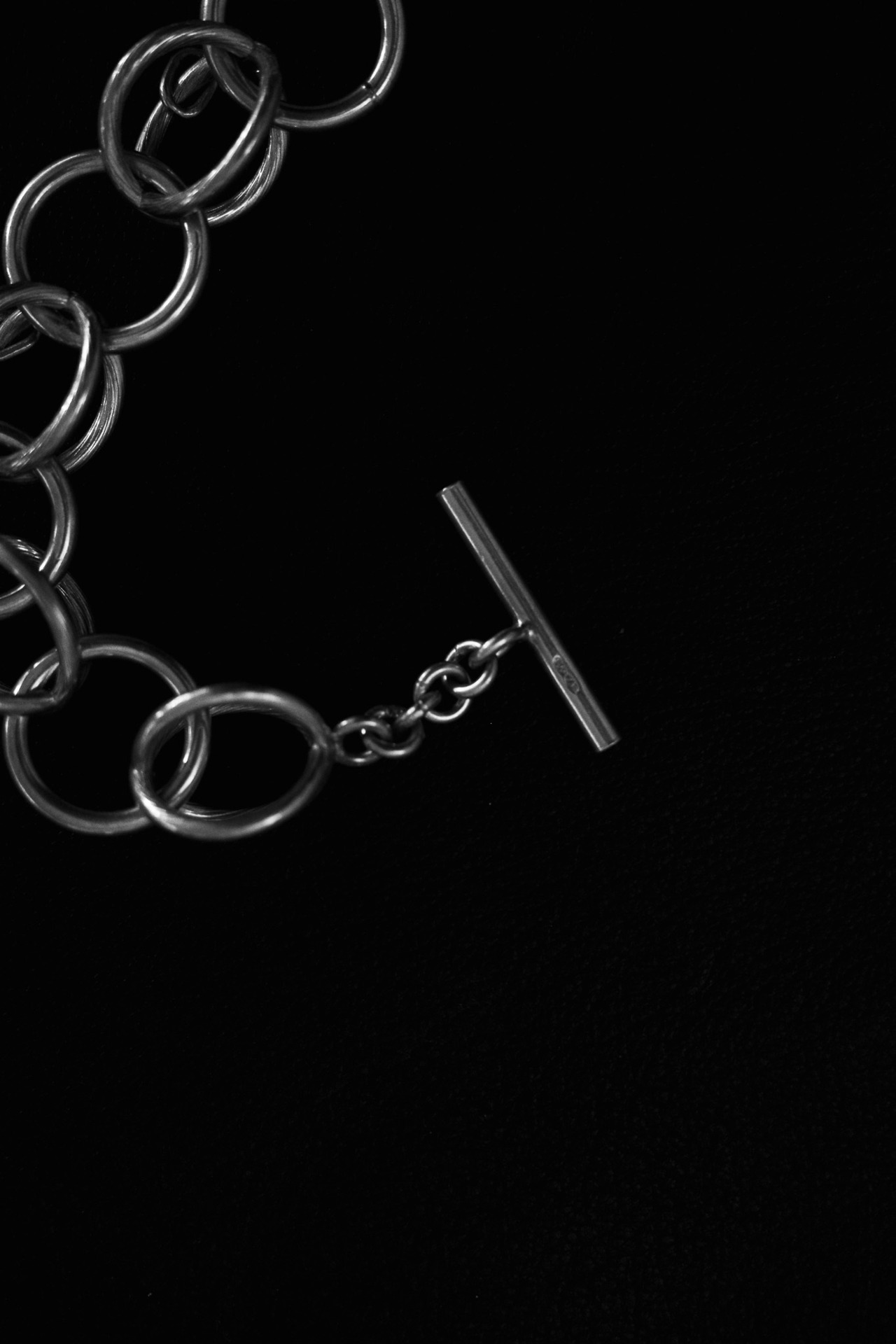 円環の美しさに、構造的なリズムを与えるようにデザインされた一本。クロスしたリンクとシングルリンクが交互に並び、交差部分には極小のリングが散りばめられています。この微細なリンクは単なる装飾ではなく、全体の構造を補強しながら、光の粒子のように反射を拡散させる役割を果たしています。そのため、チェーンが手首でわずかに動くだけでも多層的な輝きを生み出し、動きとともに生きる造形となっています。