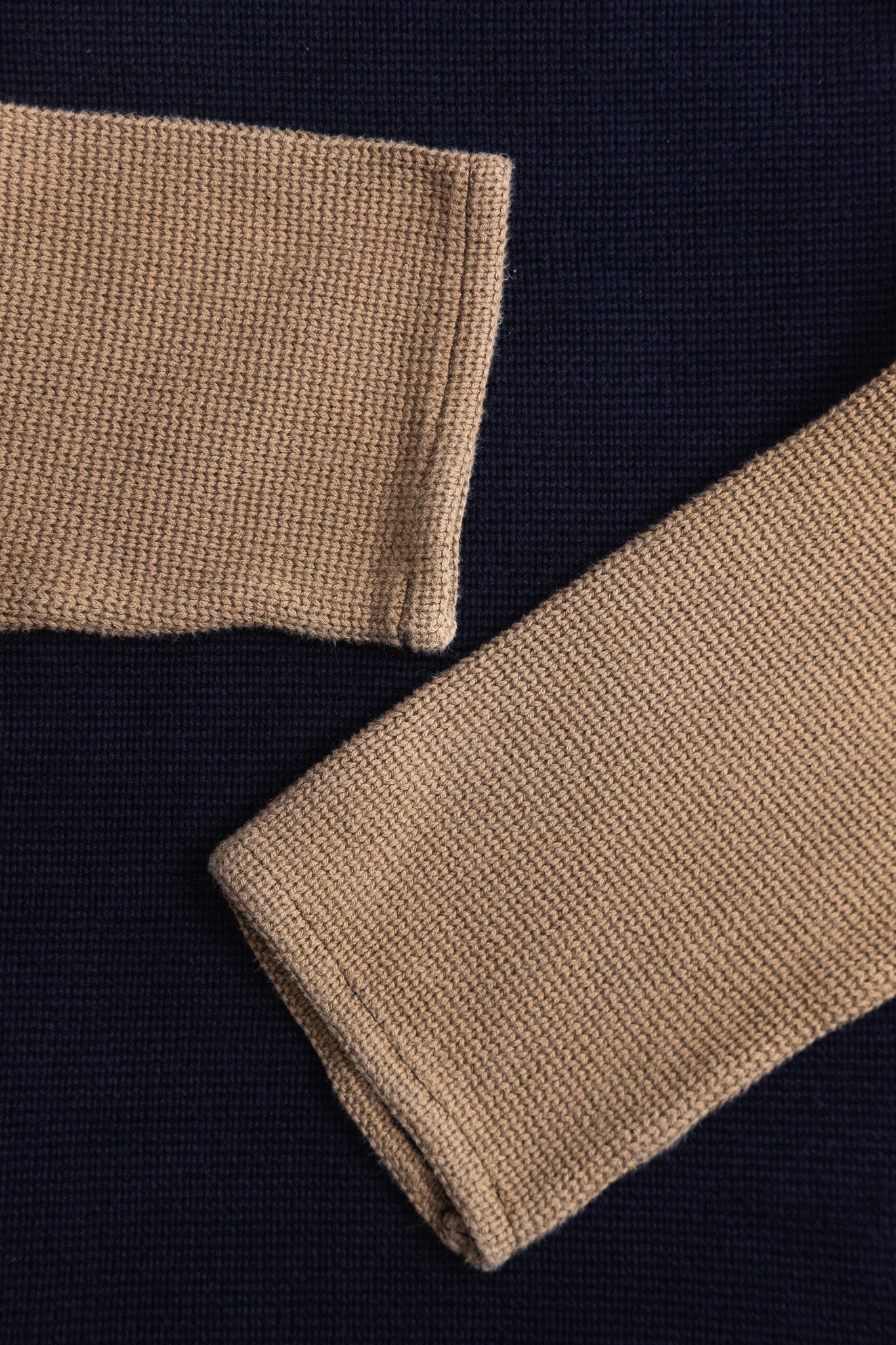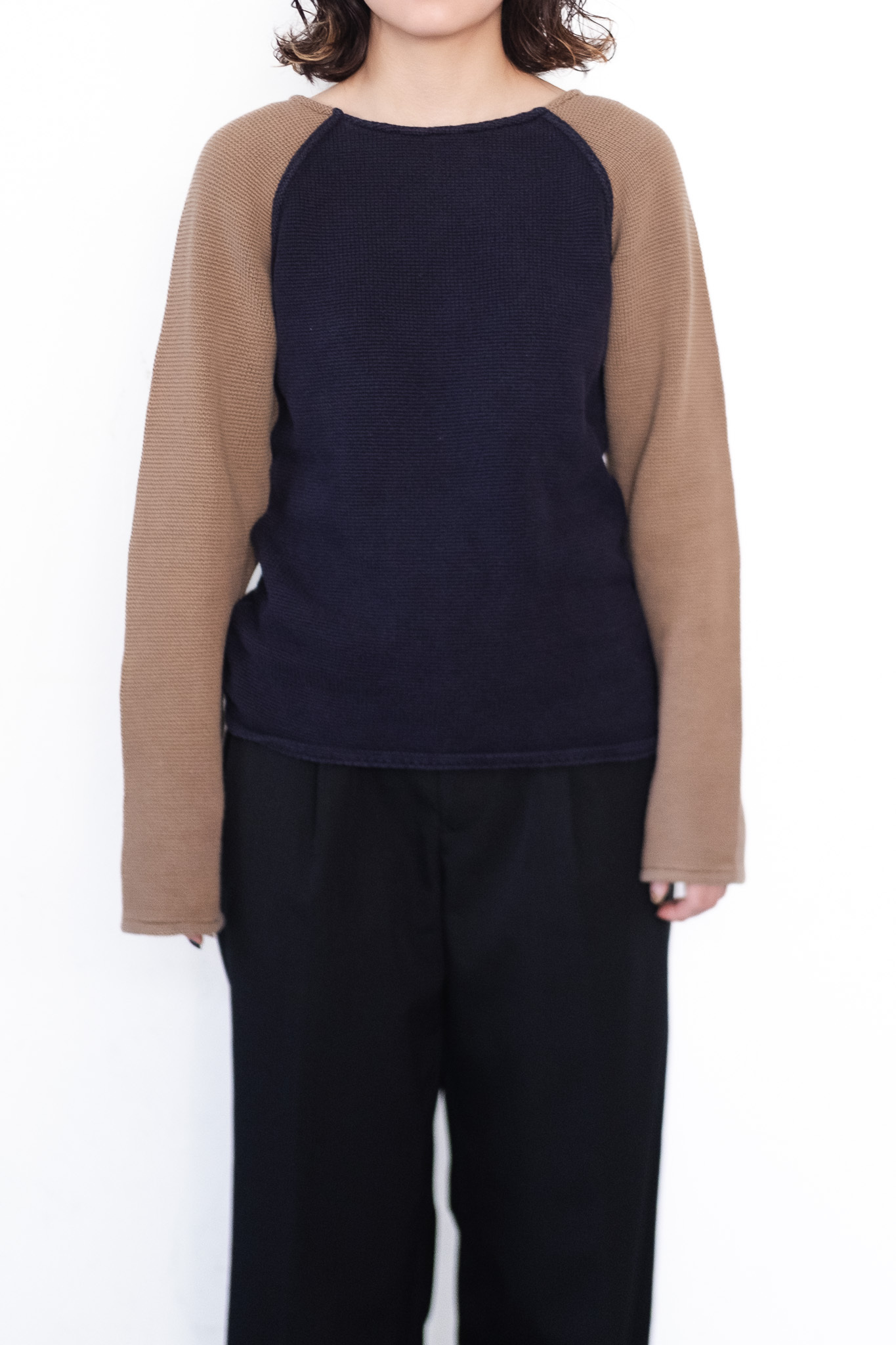 まるでベースボールTシャツのような発想を、あえてニットで表現している。