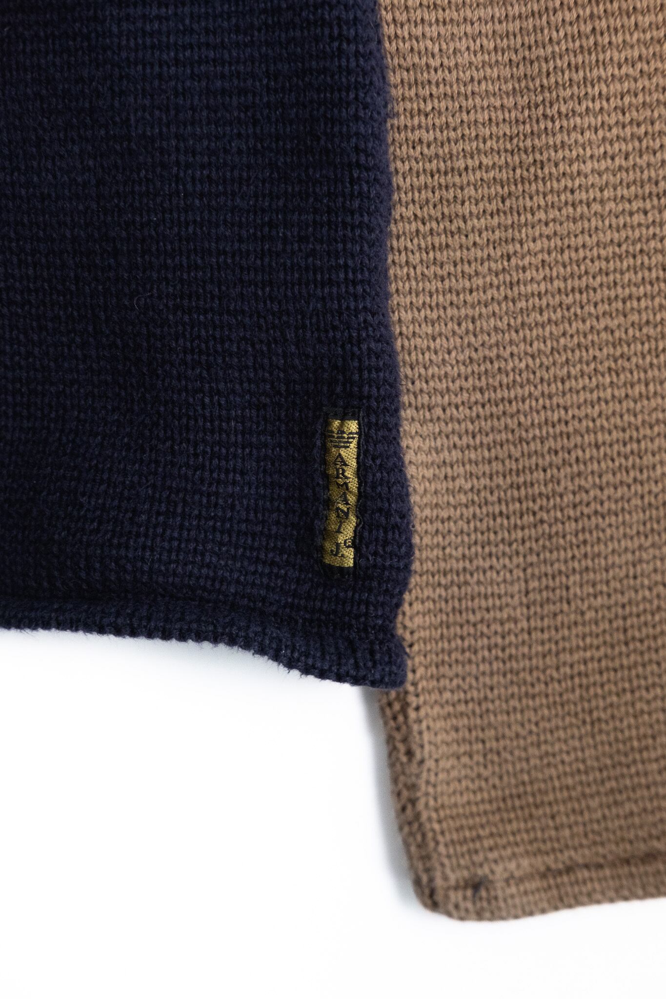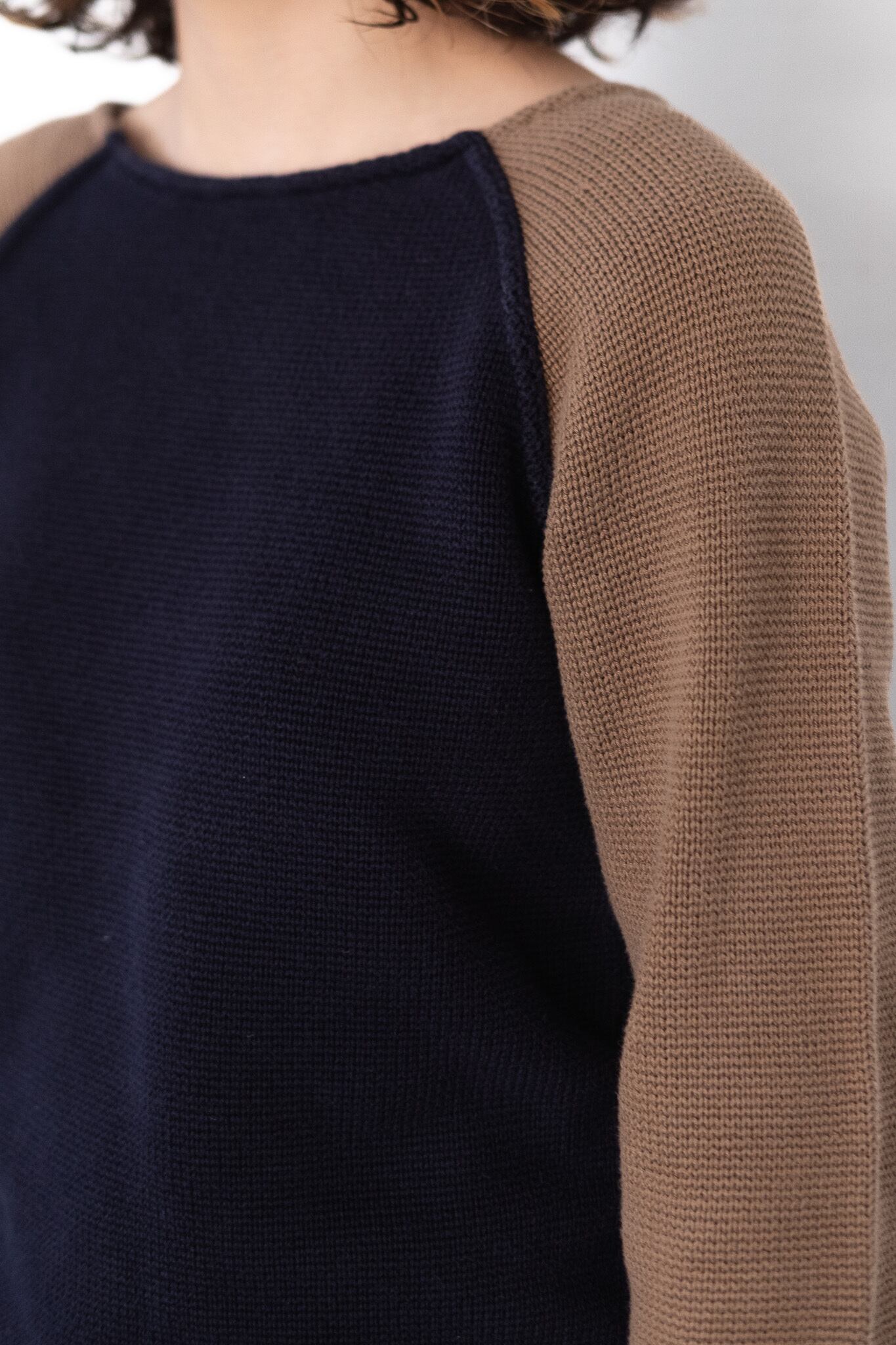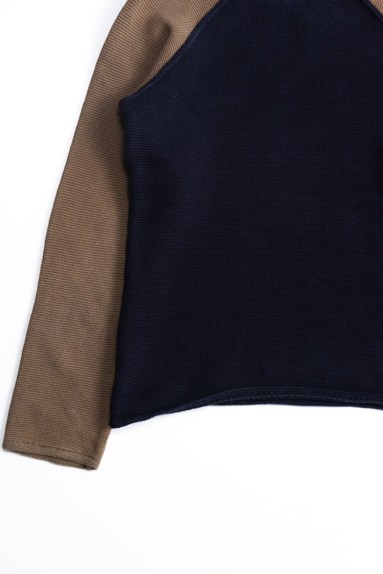 デザインはネイビーのボディに、ブラウンの袖を組み合わせたツートーン構成。