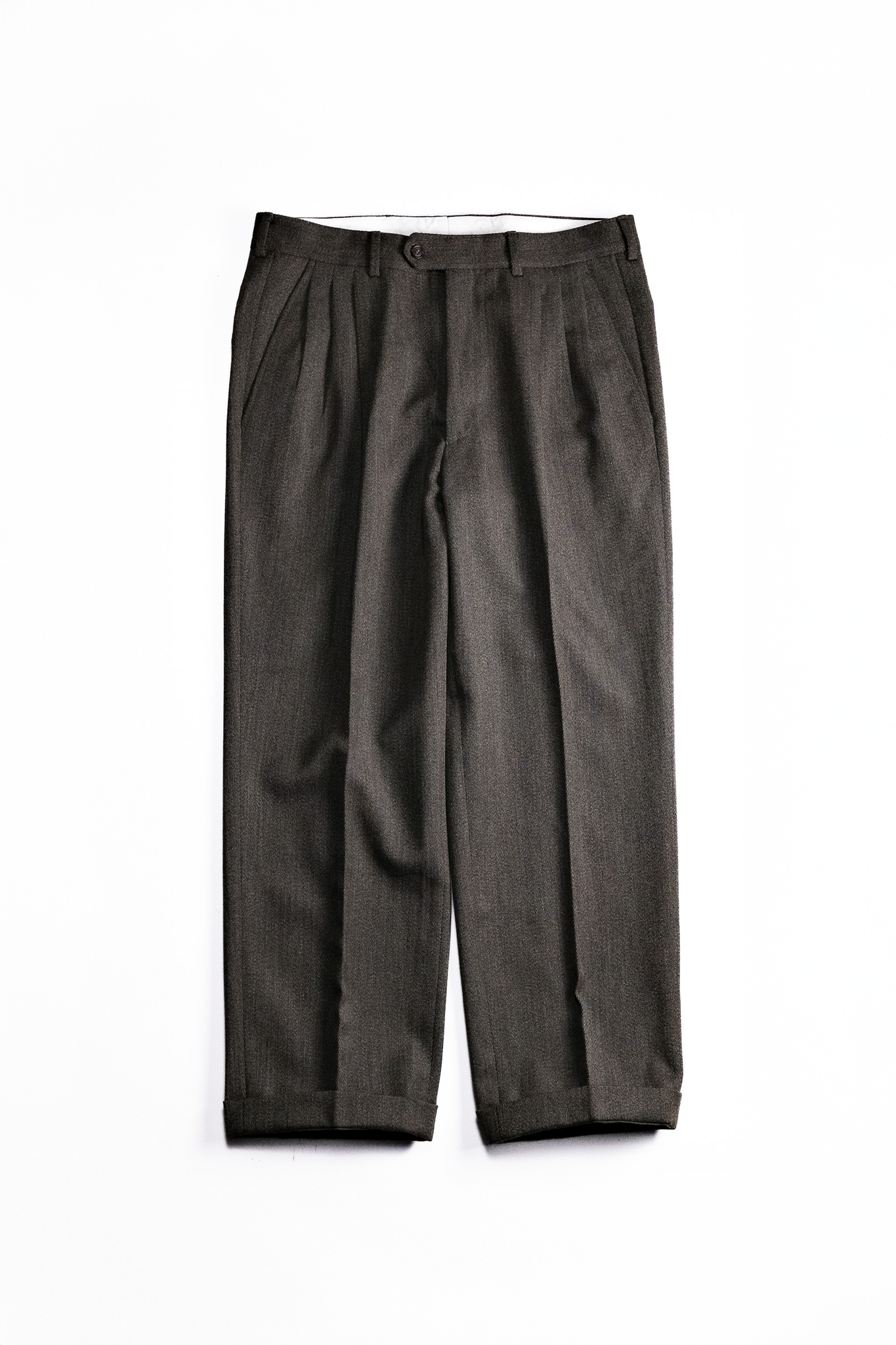 このトラウザーズに採用された生地は、わずかにブラウンを帯びたグレー杢。