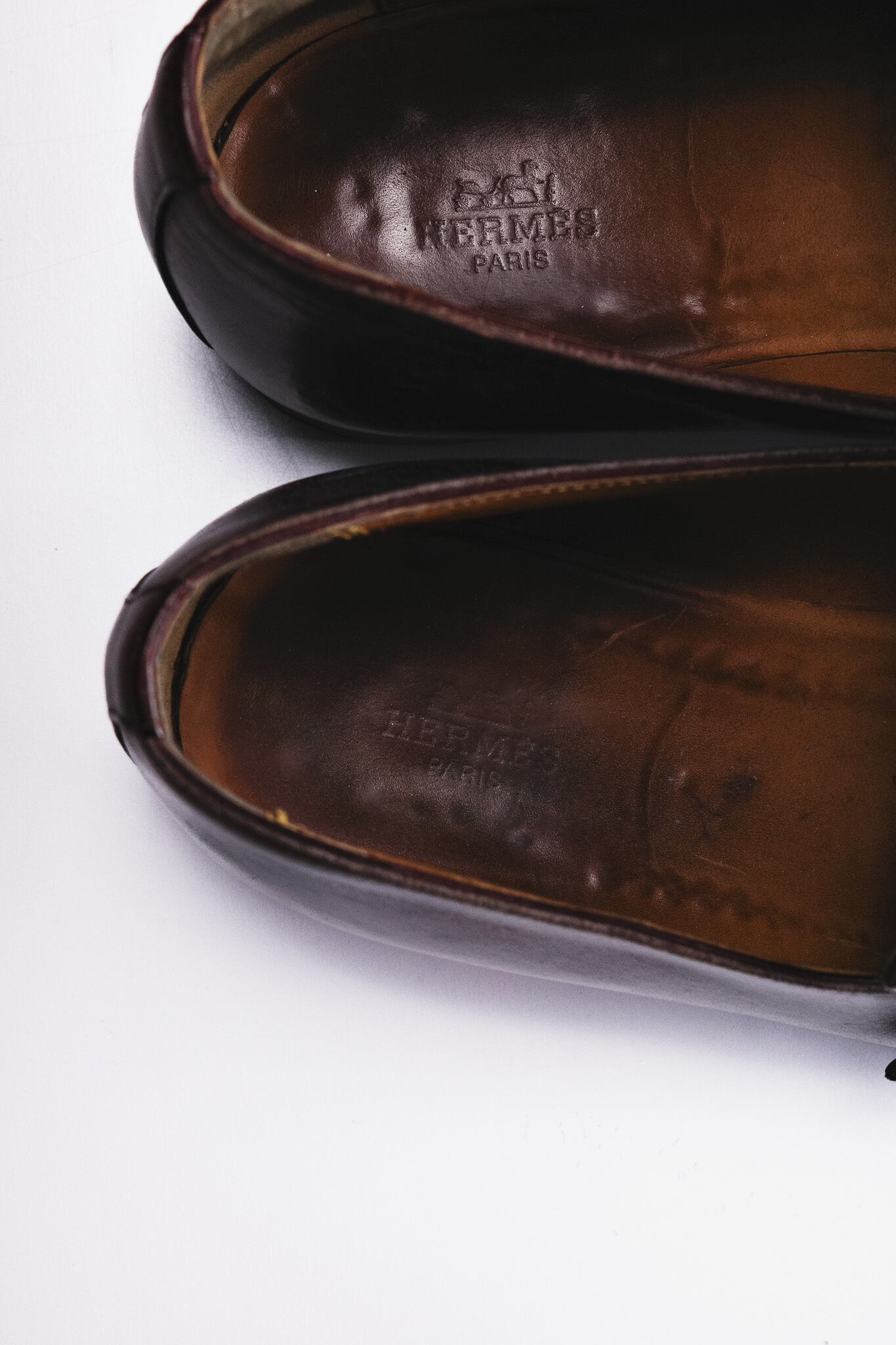 アッパーには深みのあるダークブラウンのカーフレザーを採用。しなやかさとハリを兼ね備えた革質は、当時エルメスが追求していた「素材そのものの贅沢さ」を体現しています。使い込むことで艶を深め、履く者の時間を吸い込むように育っていく、まさに“革と共に歩む”ための一足。