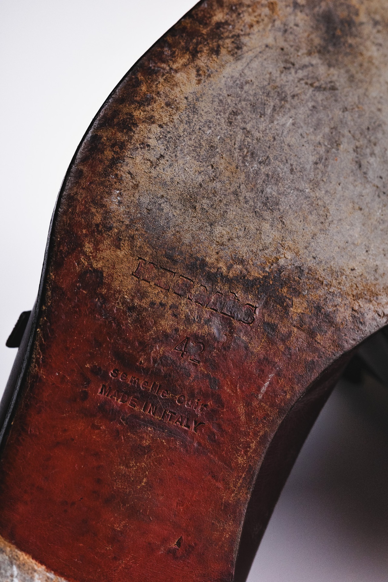 この時代のHermèsでは、ジョンロブ製のクラシックラインとは別に、ごく限られたルートでイタリア製のハイグレード・ラインが存在しました。中でもサントーニ製は、Hermèsがそのクラフツマンシップを信頼し、OEM供給を委ねたことで知られています。