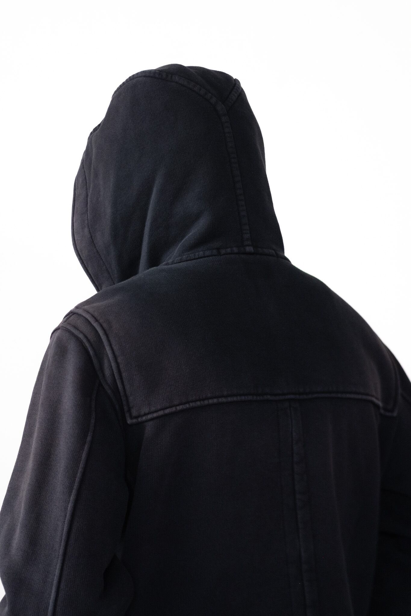 フードの三枚接ぎ構造とV字のテンションライン、肩のガンパッチ、袖付けのカーブ。