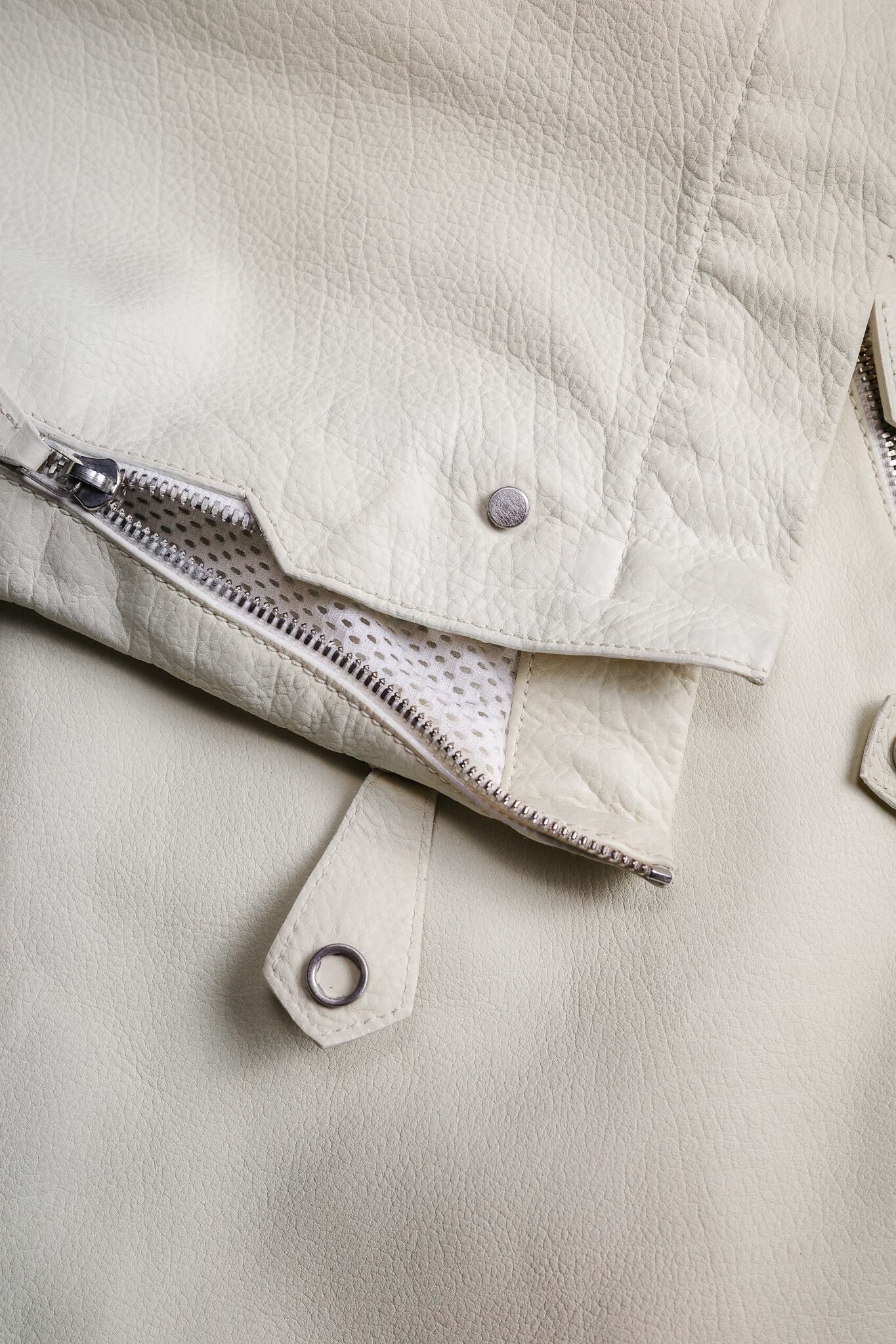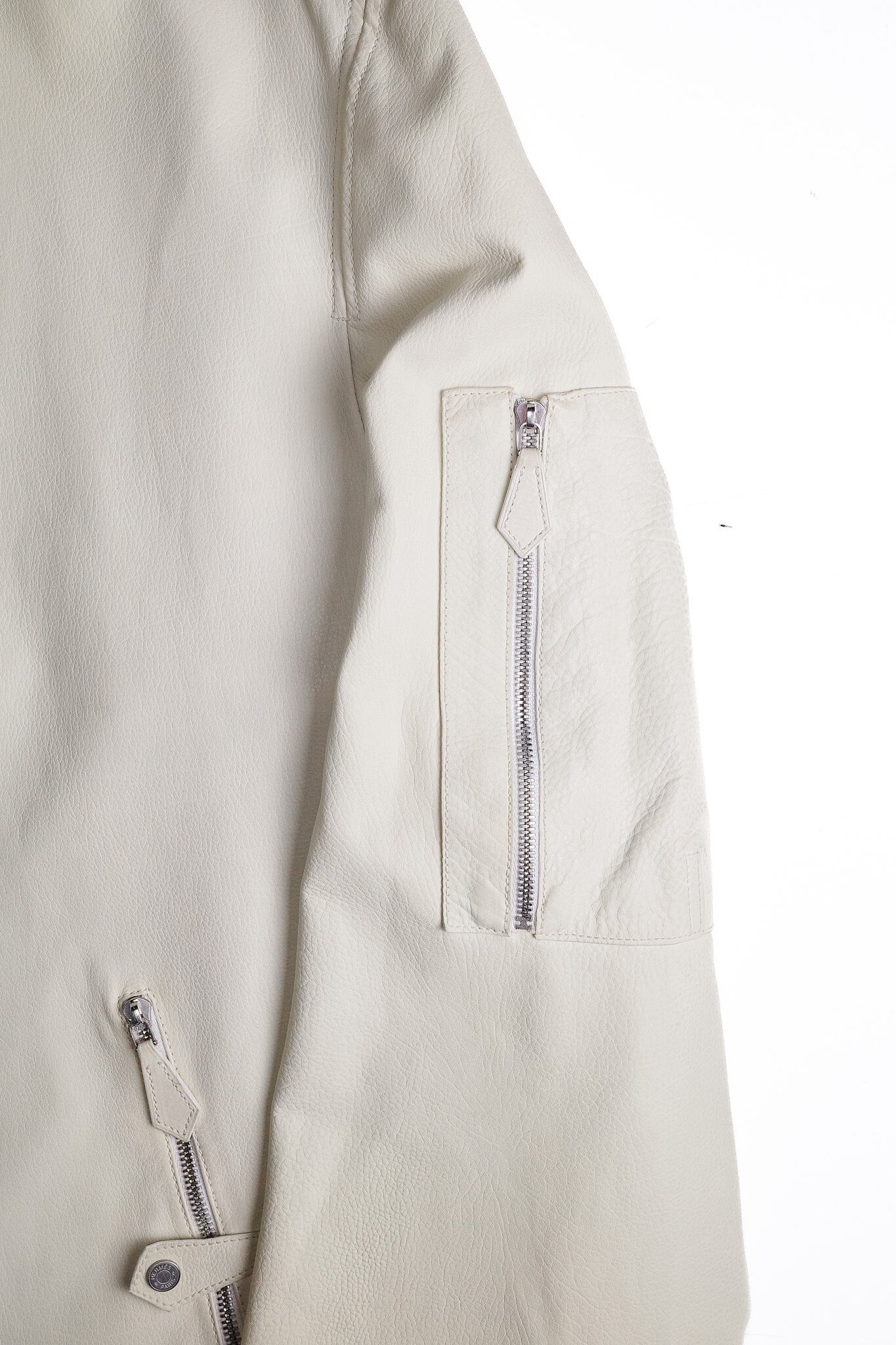 白〜アイボリー系のレザーは、もともと隠しごまかしが効きません。革の表情がそのまま露出してしまうため、原皮の段階でクオリティが低いと、全てが表に出る素材です。ところが、このジャケットはどのパネルにも“ばらつき”がありません。毛穴の並び、シボの細かさ、光の返り方。どこを切り取っても水準が同じで、原皮の質が相当に高いことが一目で分かります。