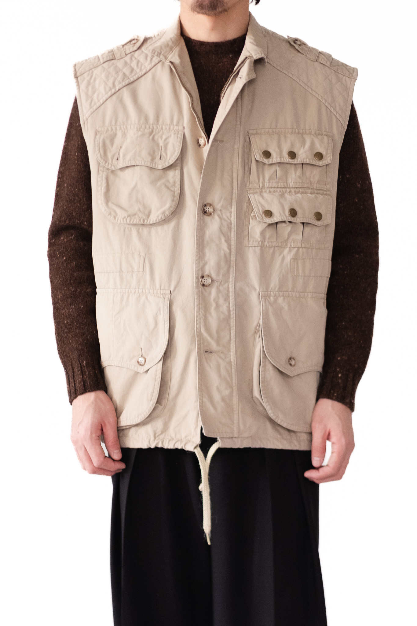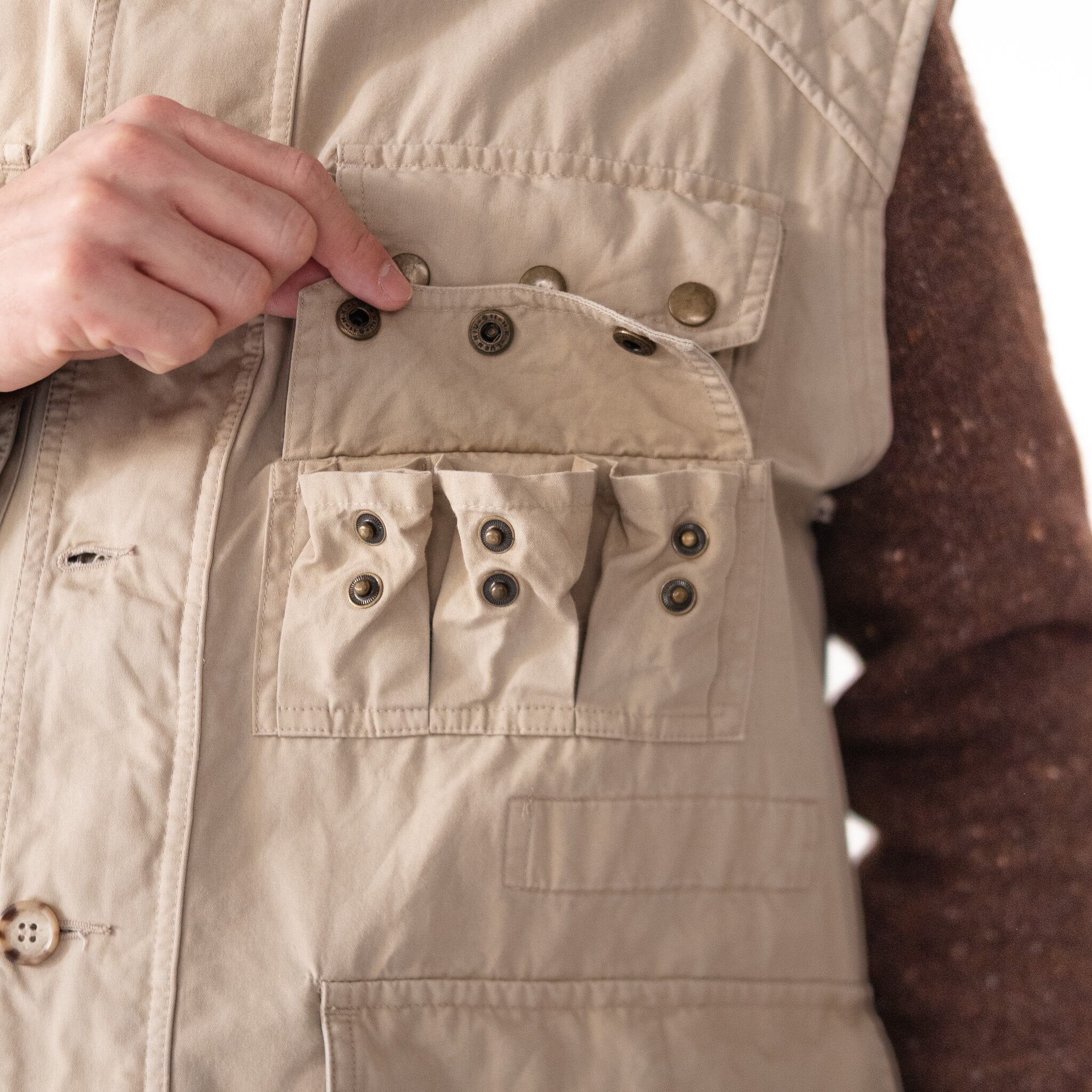 フロントには大小のフラップポケットが複数レイアウトされ、特に右胸に配置された二段式ユーティリティポケットは、同ブランドのサファリウェアを象徴する機能のひとつです。