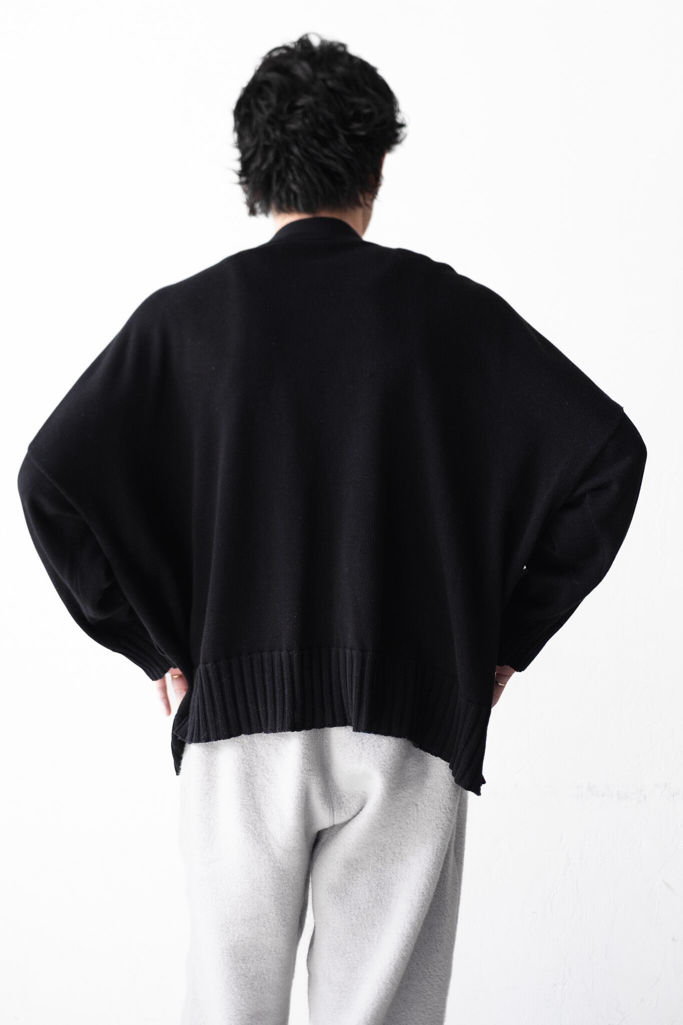 袖を通すとわかるのですが、このカーディガンは“落ち感”と“膨らみ”が同時に存在します。糸の柔らかさによって肩から自然に落ちる一方、空気を含んだ編地が体の周りに丸い空間をつくる。その空間があるからこそ、オーバーサイズでも重く見えない。そして、着る人の姿勢や動きによって微妙に表情を変えていきます。