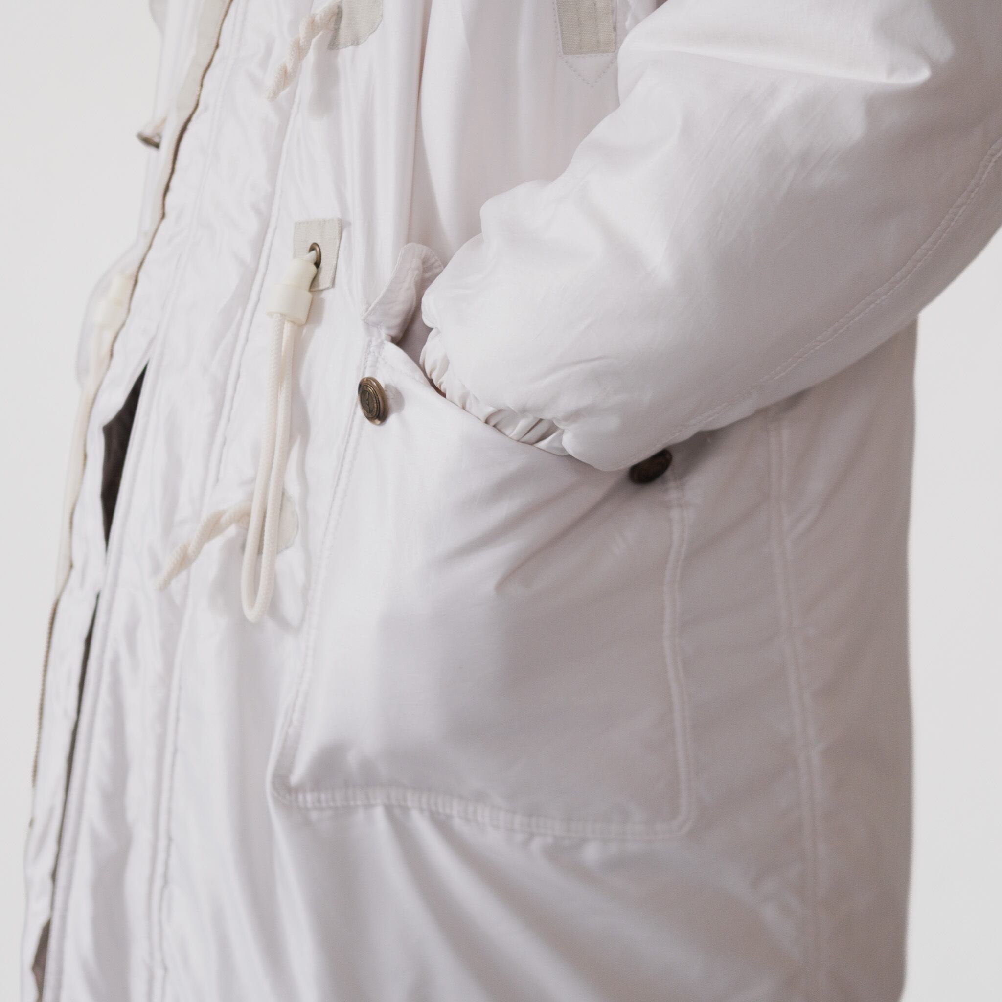 ただのホワイトではなく、ナイロン×ポリエステルの高密度シェルでつくられた白。