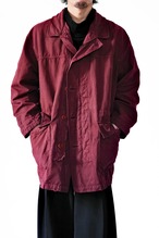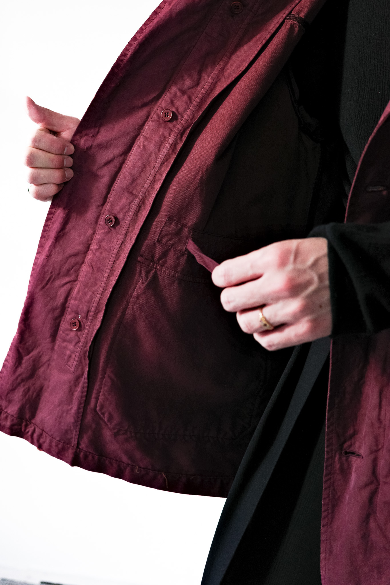 高密度に織られたコットンは、触れた瞬間に繊維の密度と強さが伝わり、その上から施されたガーメントダイが布の奥で複雑に揺らぎ、深く沈むボルドーを形成しています。