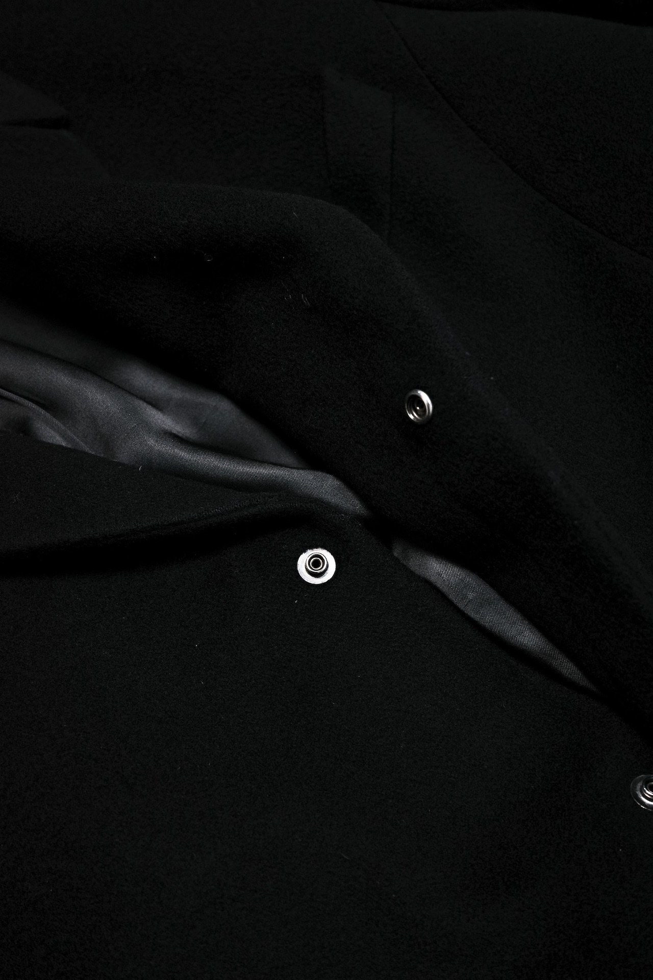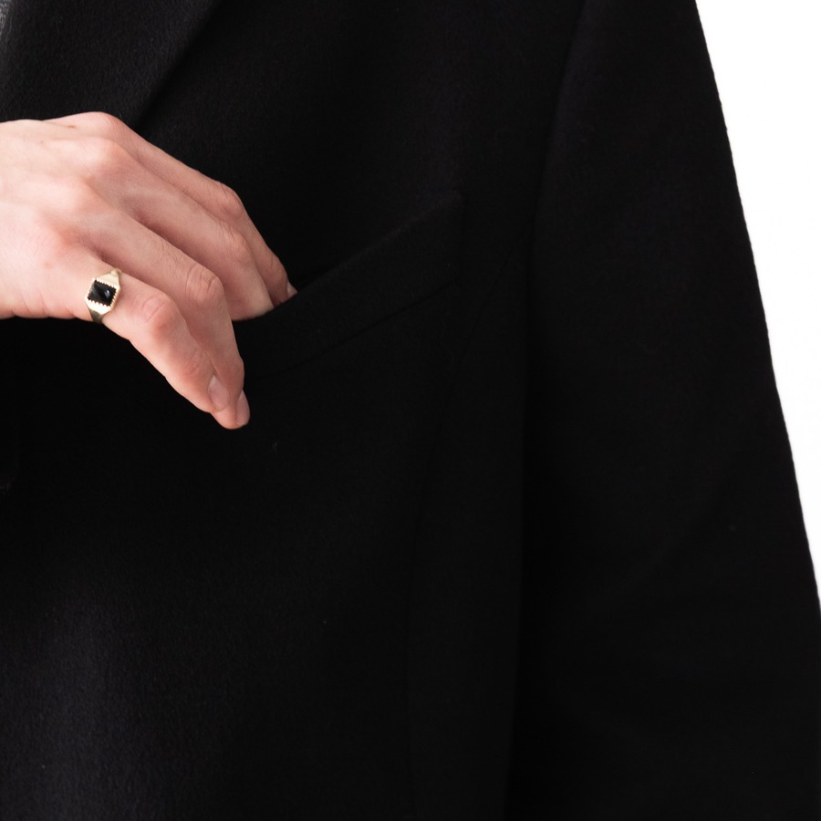 ボタンホールを見せないことで、素材の密度や縦のラインがより強調され、佇まいに品のある緊張感を構築。