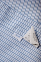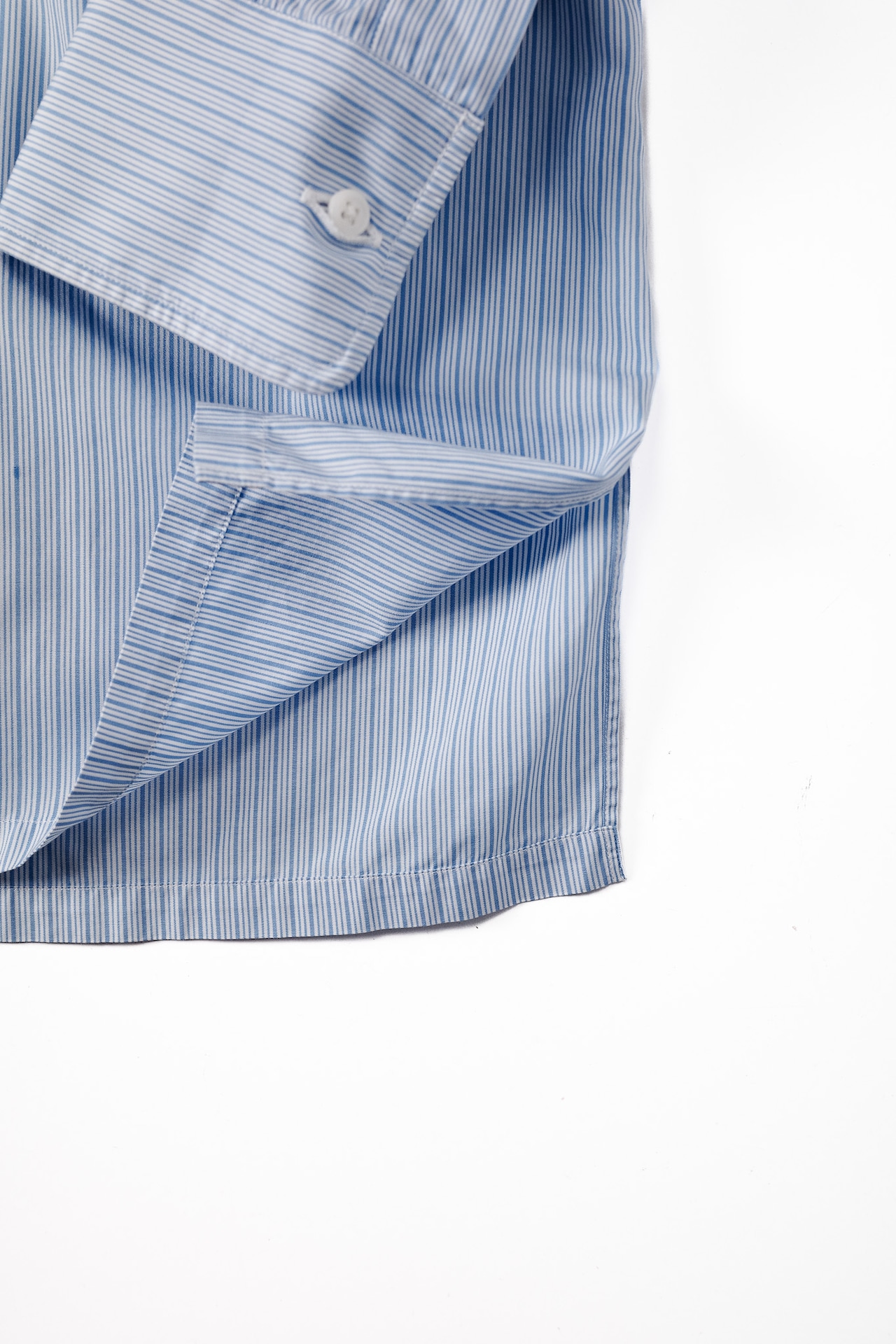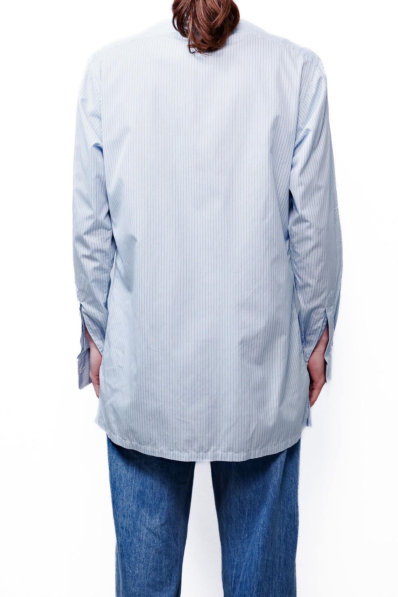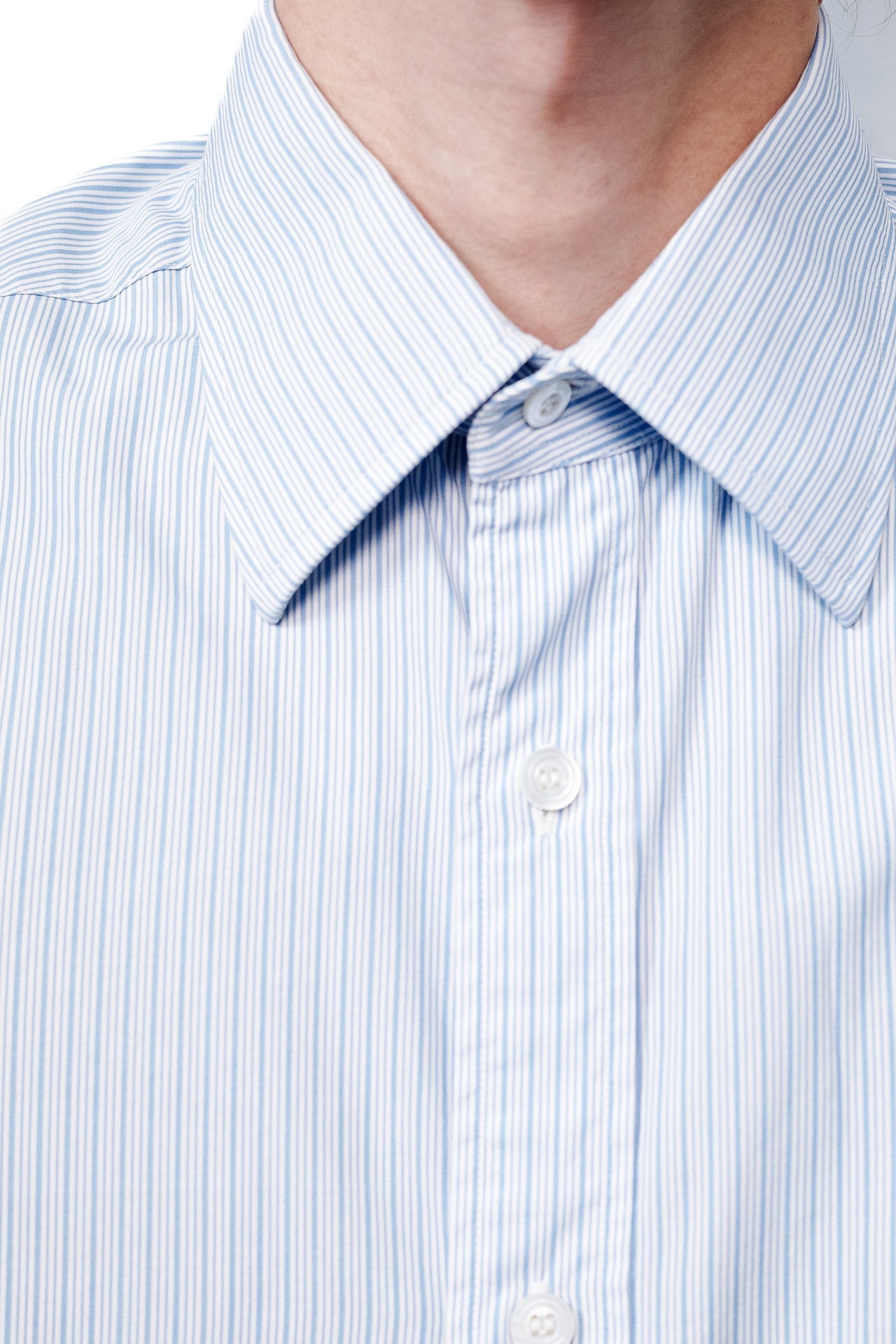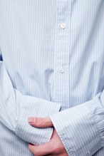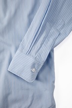 ライトブルーのマイクロストライプは、日常に最も馴染みながら、首元に清潔な陰影を生む生地。