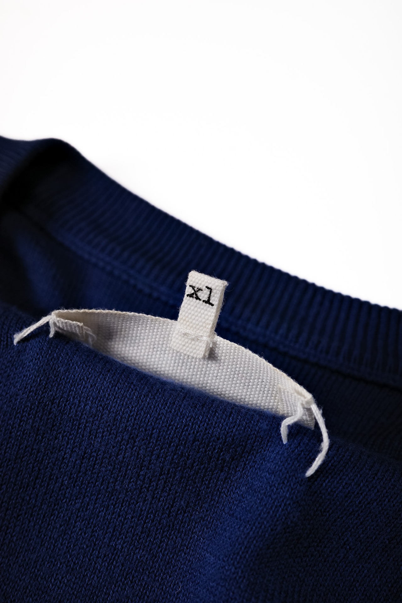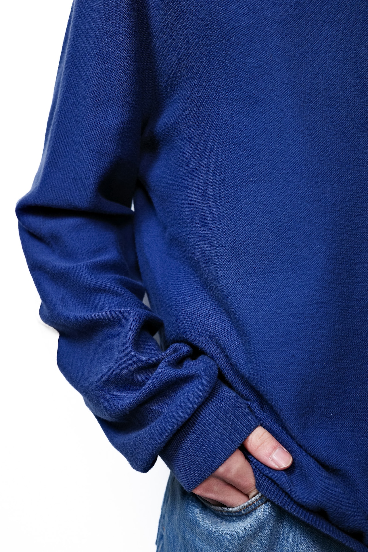 ウールとは異なる軽さとさらりとした質感で、通年に近い季節で着られる快適さがあります。コットン素材ならではのクリアな発色が生きており、深みのあるロイヤルブルーが印象的です。光の当たり方でわずかに表情が変わり、シンプルな単色でありながら奥行きのある雰囲気をまとっています。