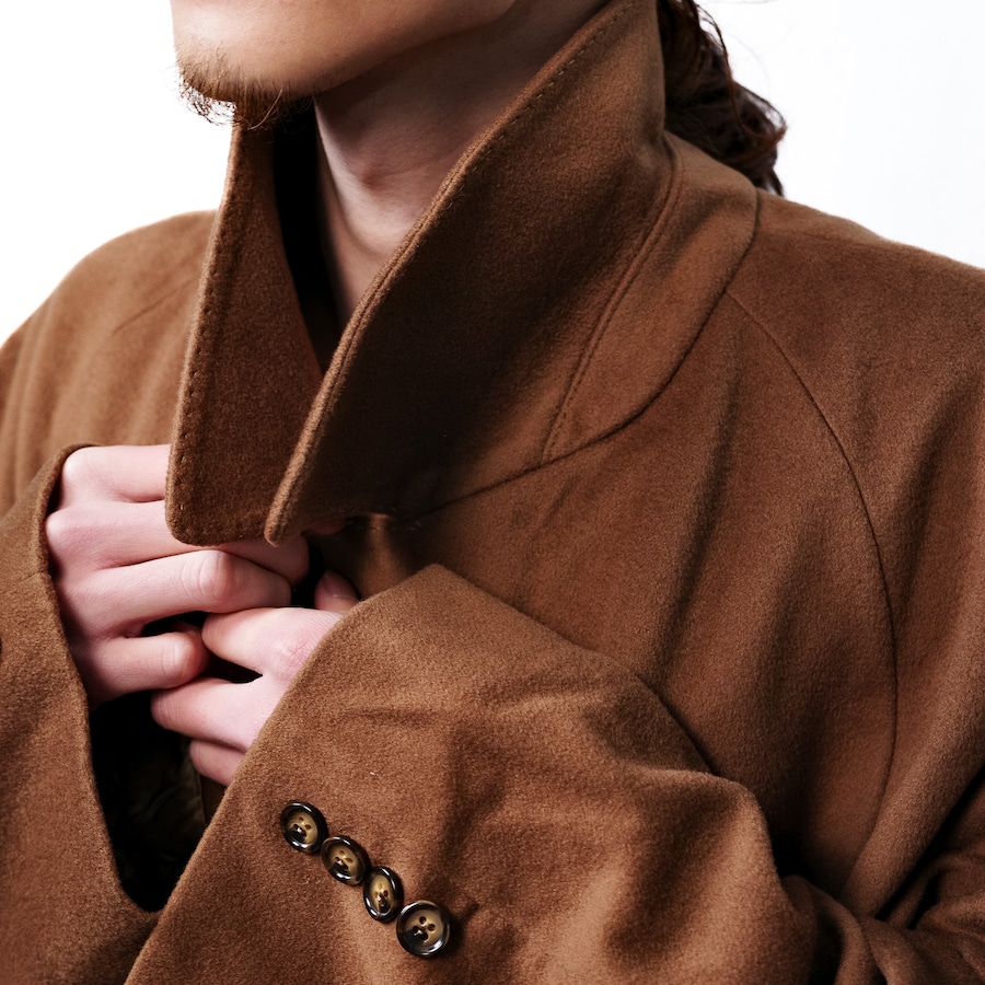 襟を寝かせればオーセンティックなステンカラーコートとして機能し、襟を立てて着用すると、首元を包み込むようなハイカラーに変化します。