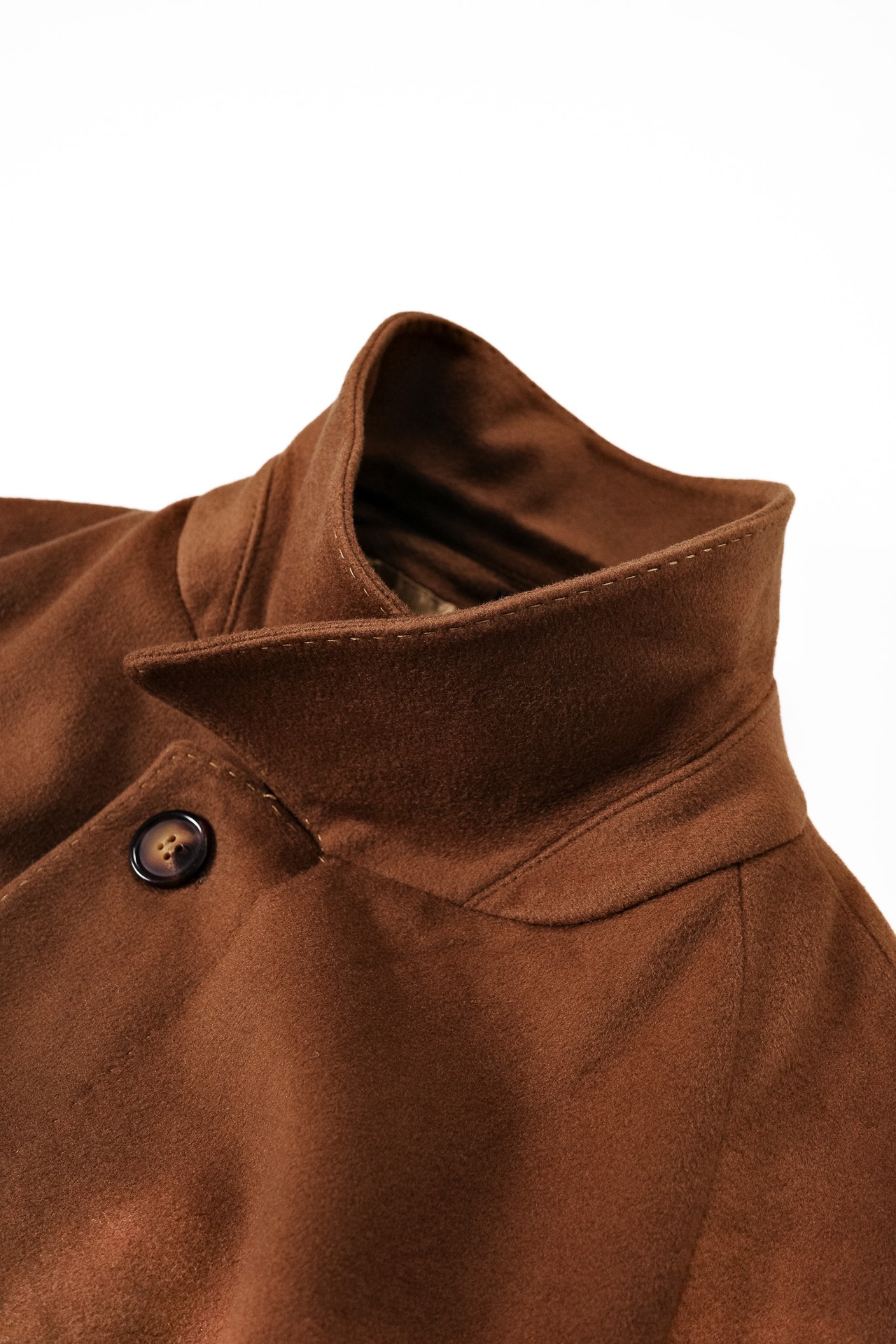 短めの起毛をうっすらとかけることで、光を柔らかく受け止めるマットな表情と、カシミア特有のぬめり感が同居しています。